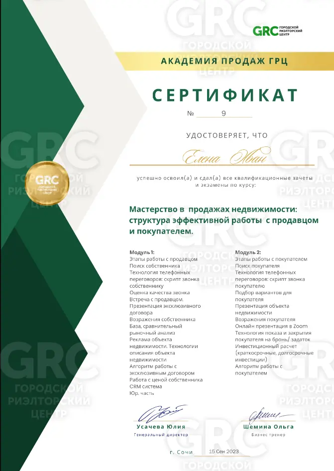 При выборе компании для работы в сфере недвижимости для себя ставила принципиальными наличие таких признаков, как честность и уважение к людям, поэтому я работаю в Агентстве недвижимости "Городской риэлторский центр", г. Сочи.
