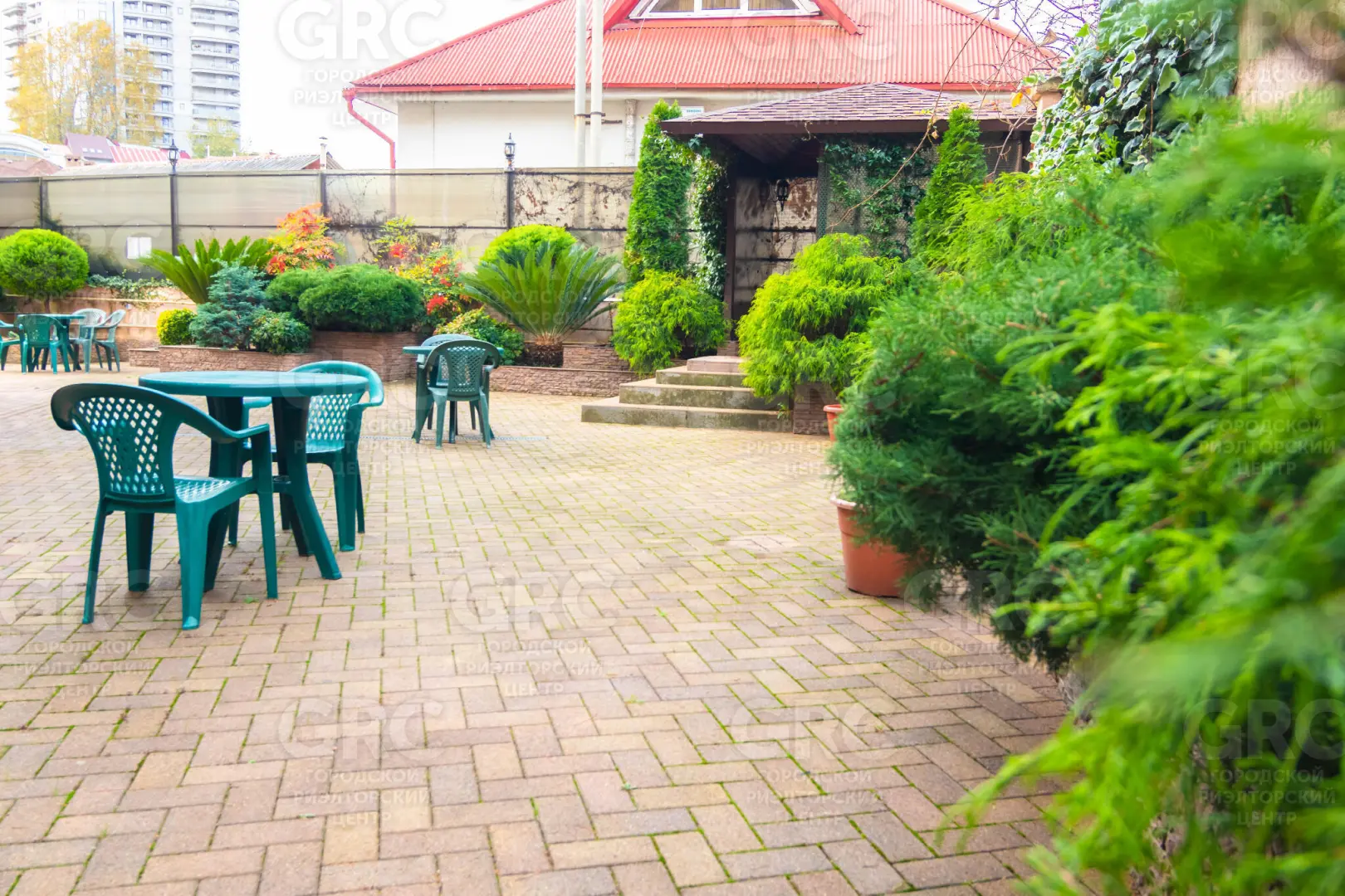Территория огорожена и имеет озеленение и зону отдыха и барбекю, летом функционирует мини бассейн.