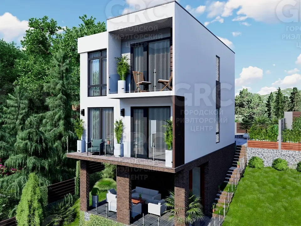 Дом: 2 этажа + цоколь с террасой. Площадь дома 180 кв.м. + эксплуатируемая кровля. Энергоэффективное витражное остекление с профилем REHAU. Наружная отделка - мраморная крошка. Планировка свободная с черновой отделкой. 2 балкона. Участок 4 сотки с возможностью устройства бассейна (по желанию клиента). Территория перед домом отделана тротуарной плиткой. Парковка как на территории так и возле дороги. Коммуникации: газ, электричество, вода, септик.