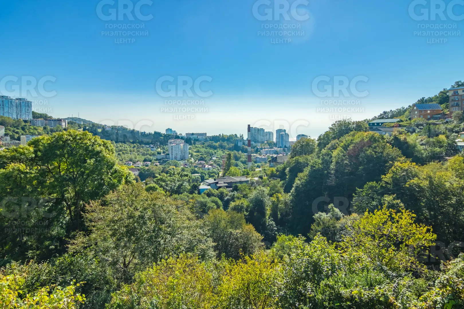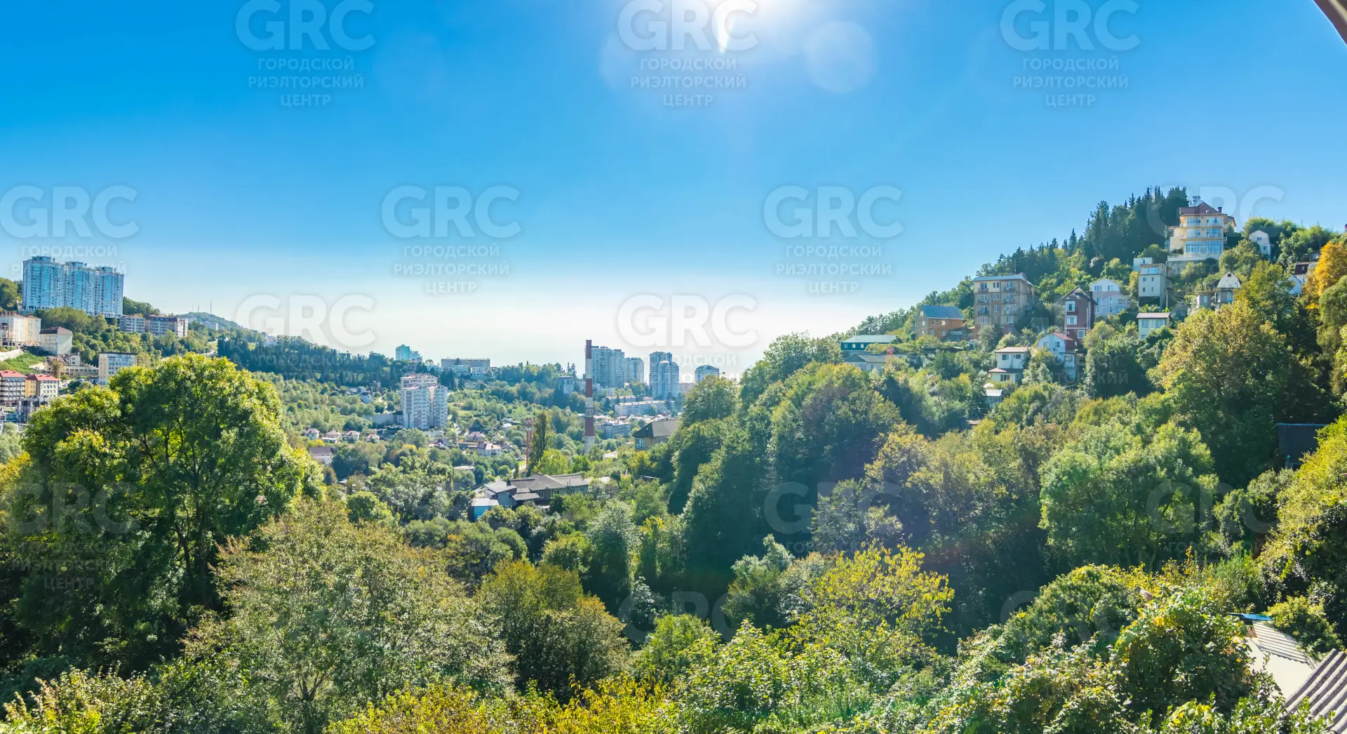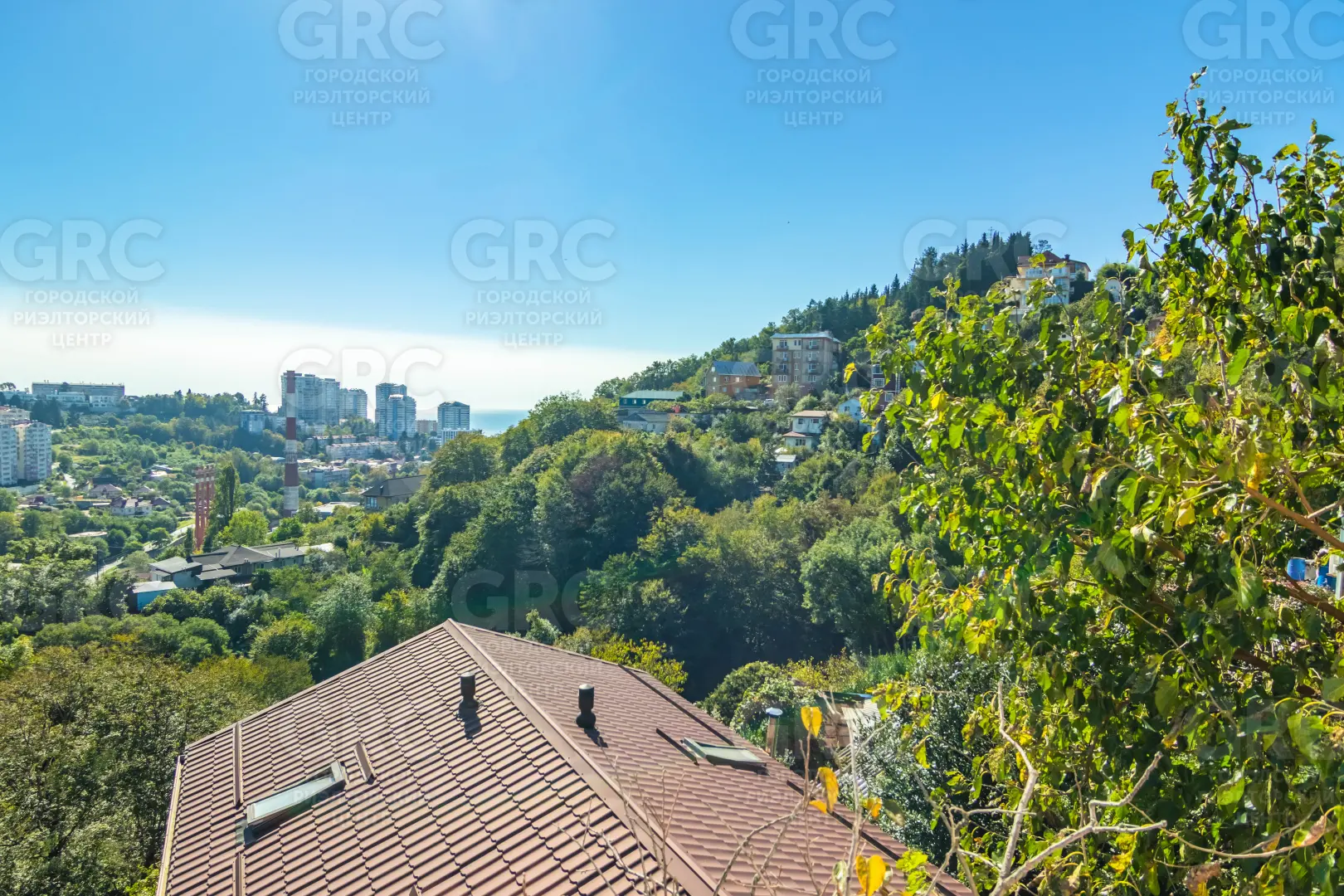 Открытый, панорамный вид на город, горы и море.