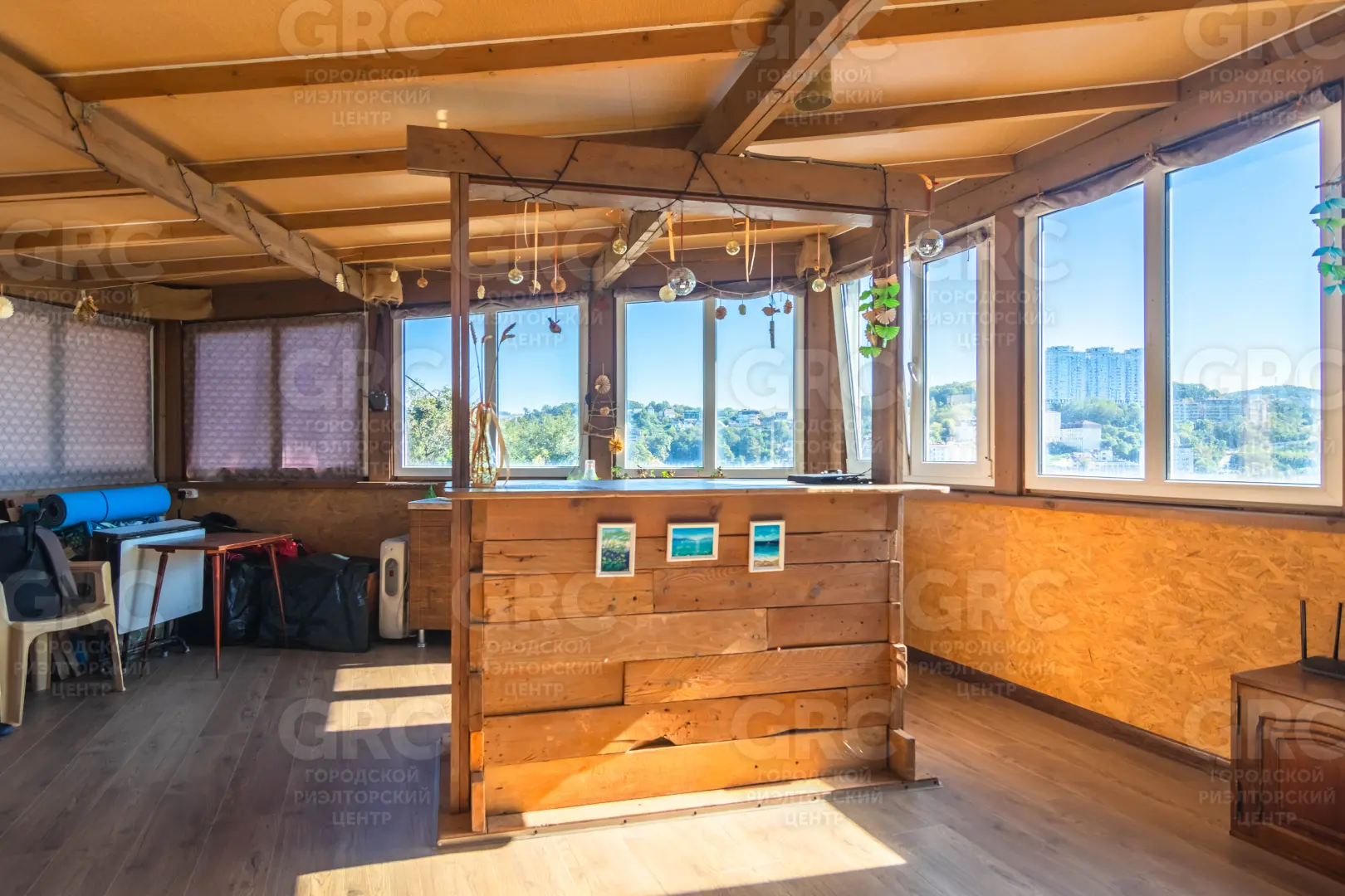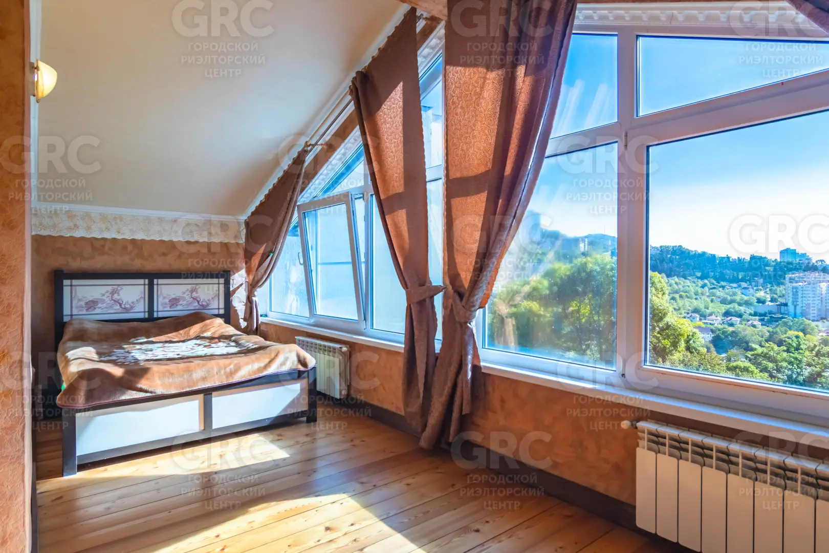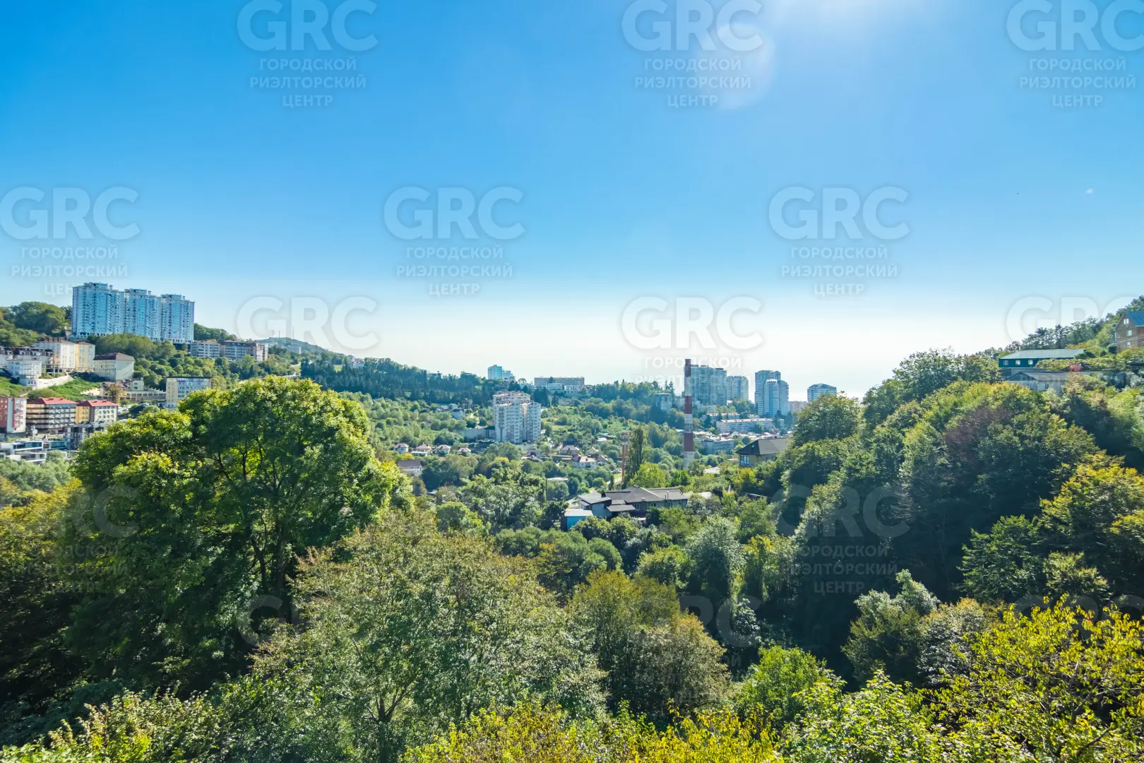 Открытый, панорамный вид на город, горы и море.