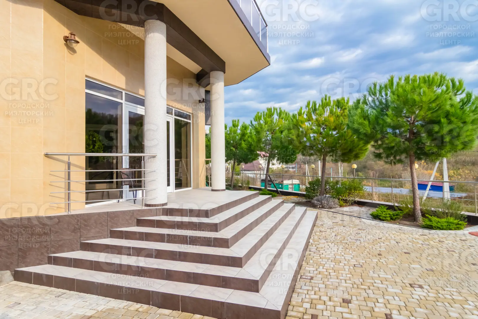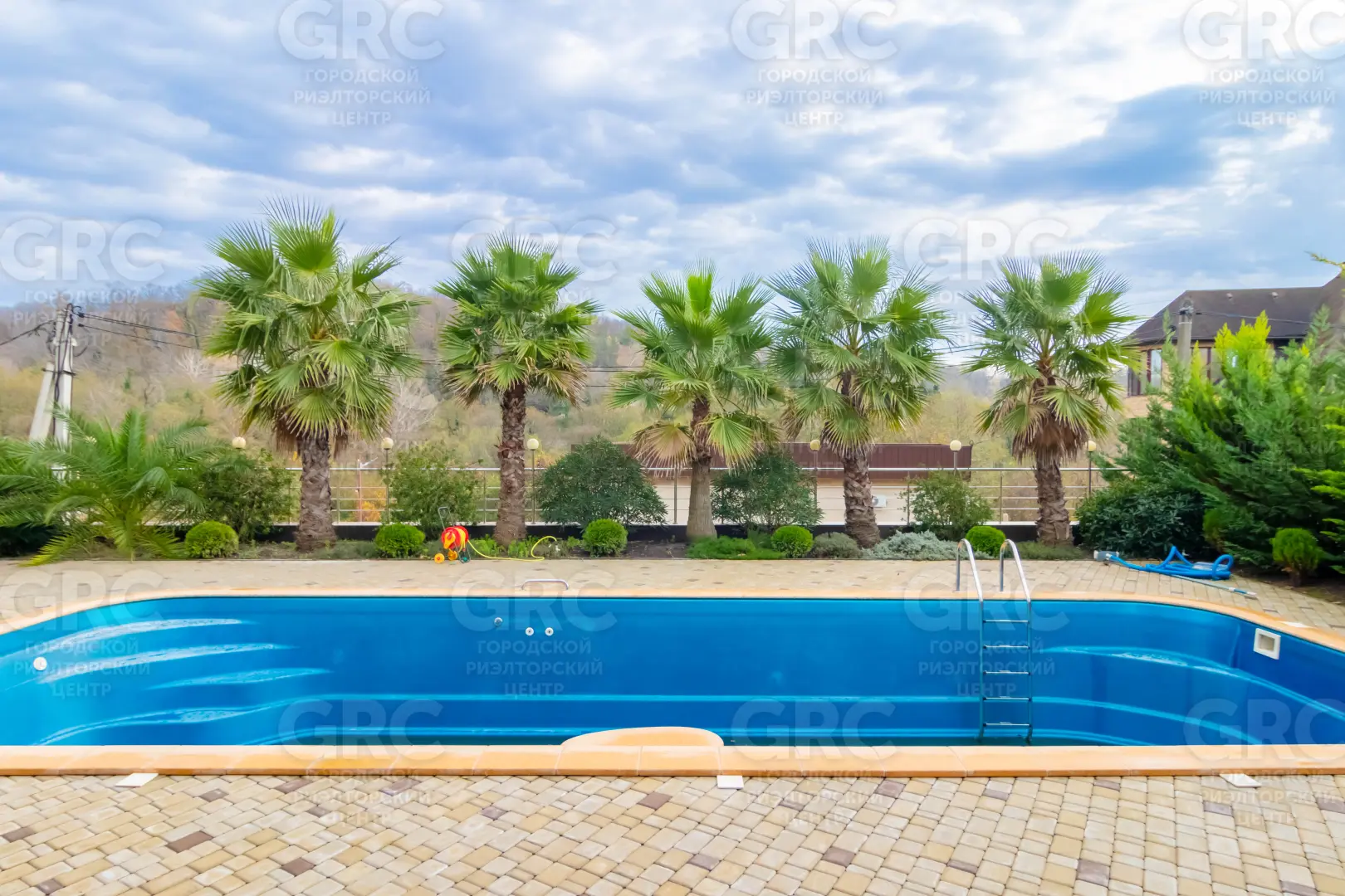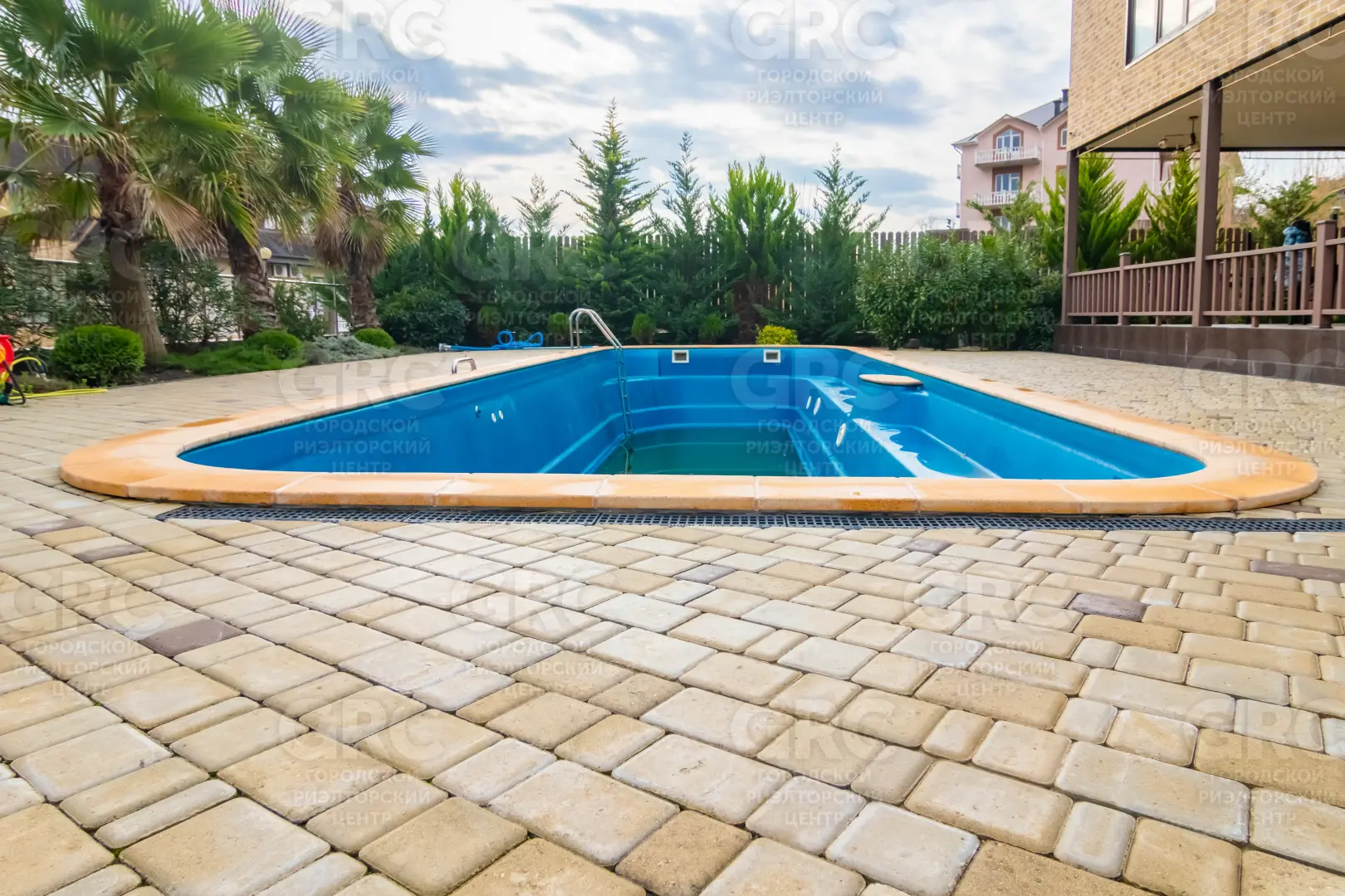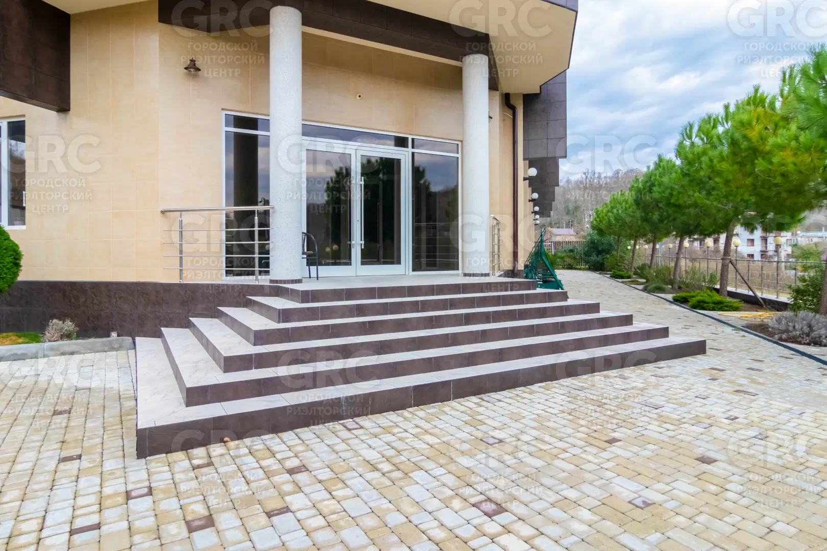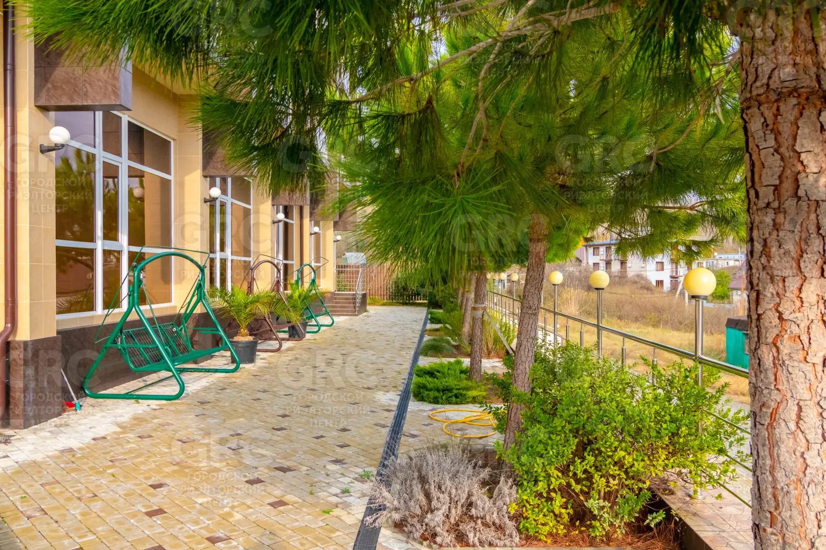 благоустроенная тротуарной плиткой с ландшафтным озеленением и поливом, растения завезены из Испании: пальмы, сосны, плодовые деревья, декоративные кустарники;