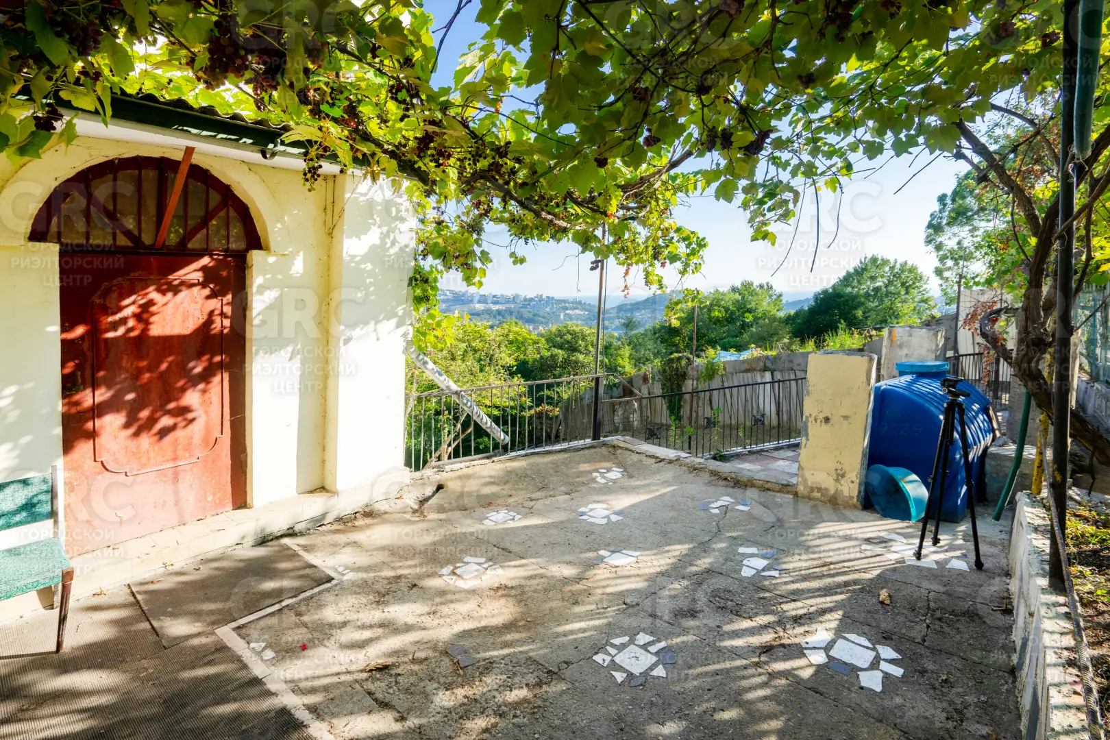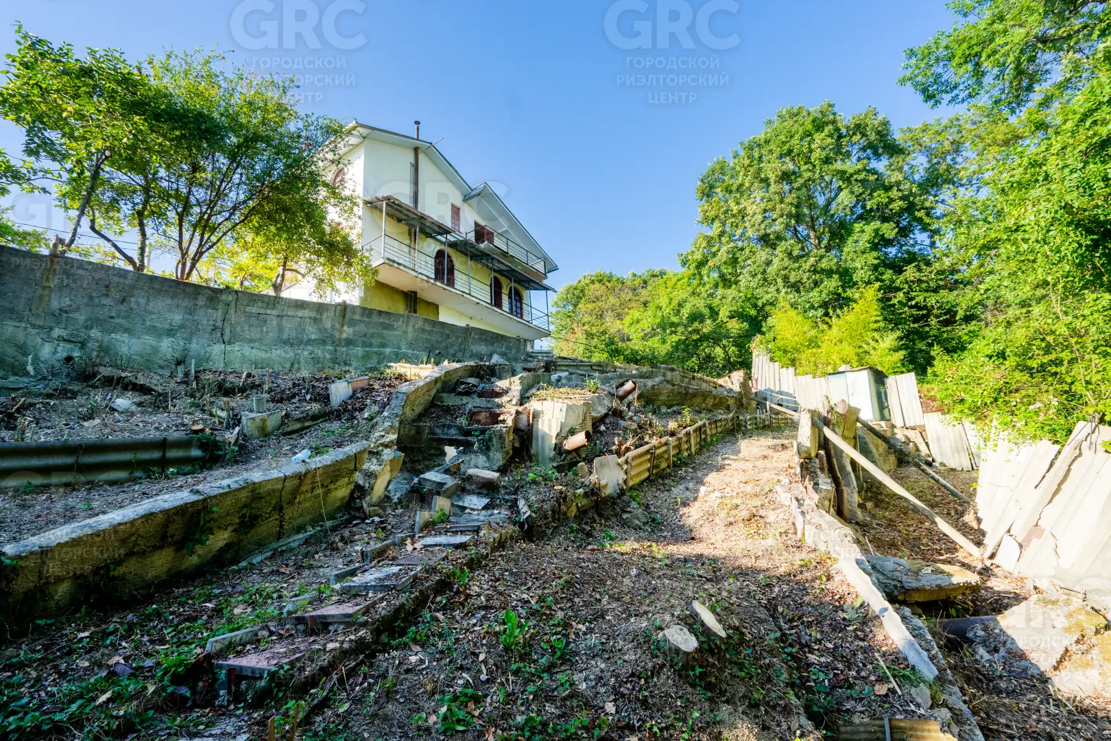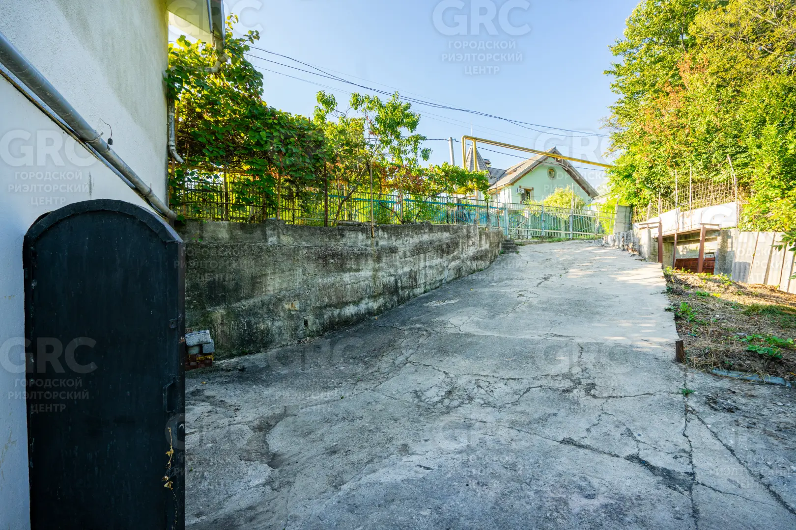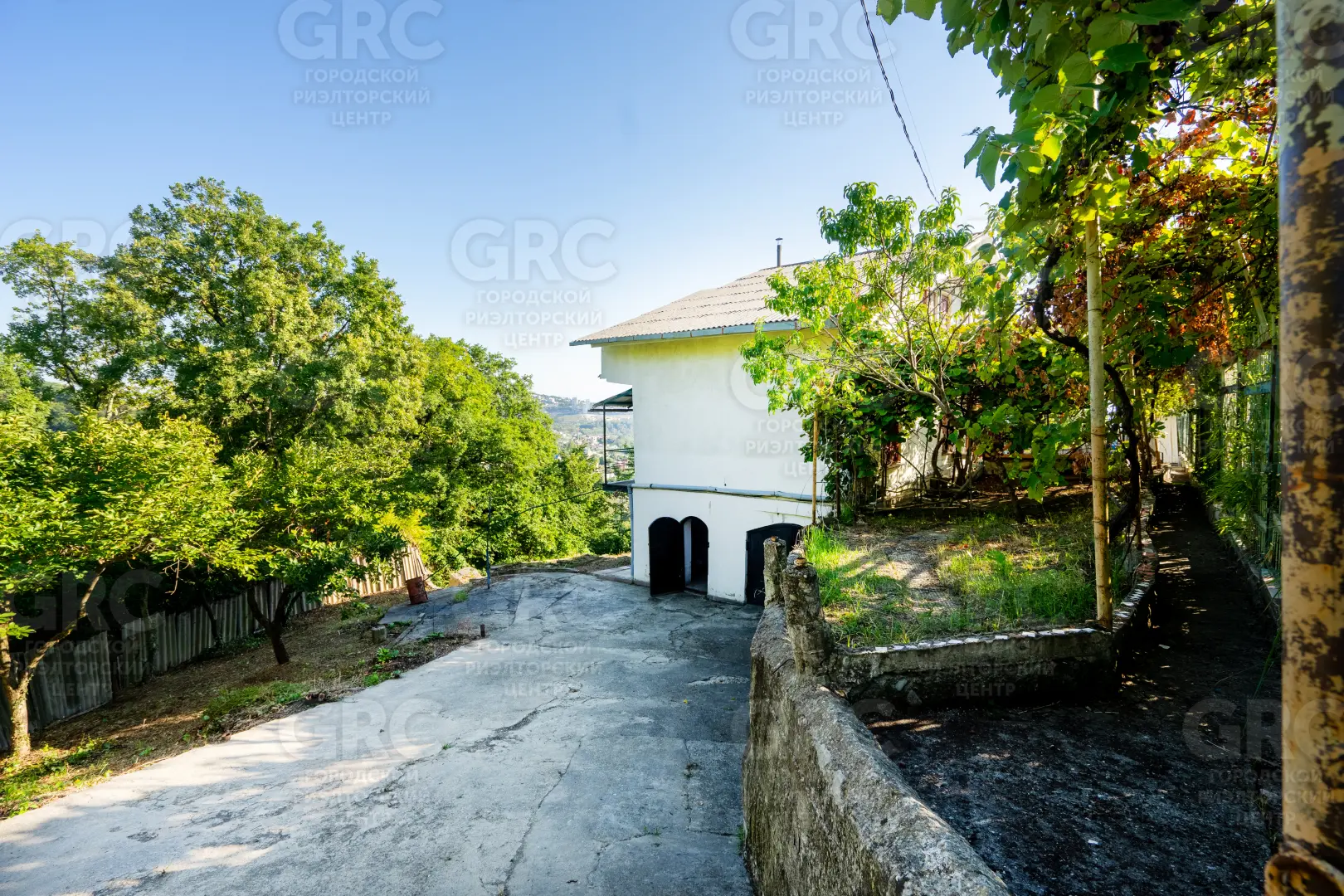 Около входа есть тенистая терраса из лозы винограда, въезд на участок осуществляется к нижнему уровню дома, но возможно создание горизонтальной парковки на сваях, с одной стороны участок граничит с местной дорогой, транзитное движение по которой не осуществляется, с двух сторон граничит с национальным парком.