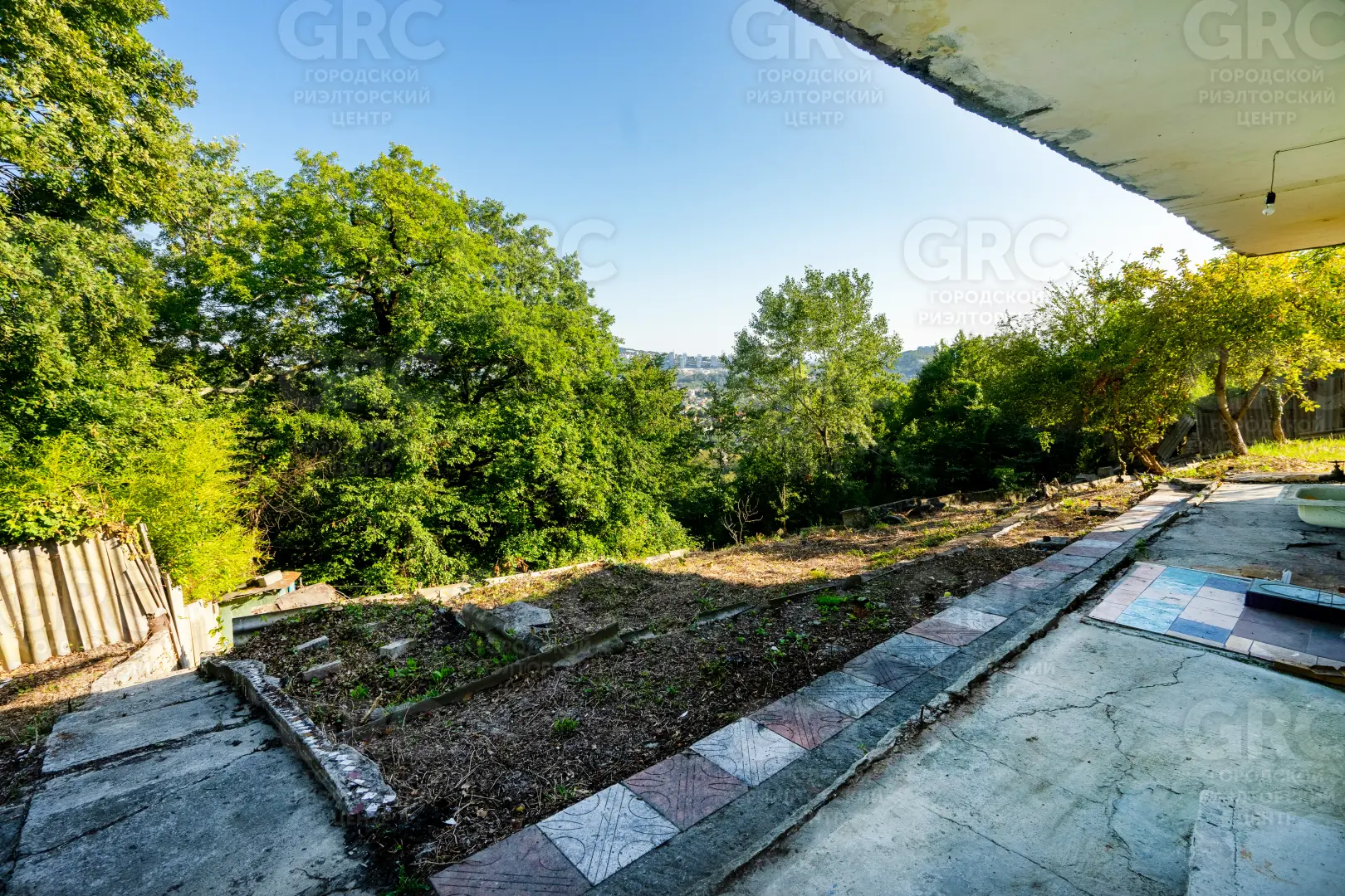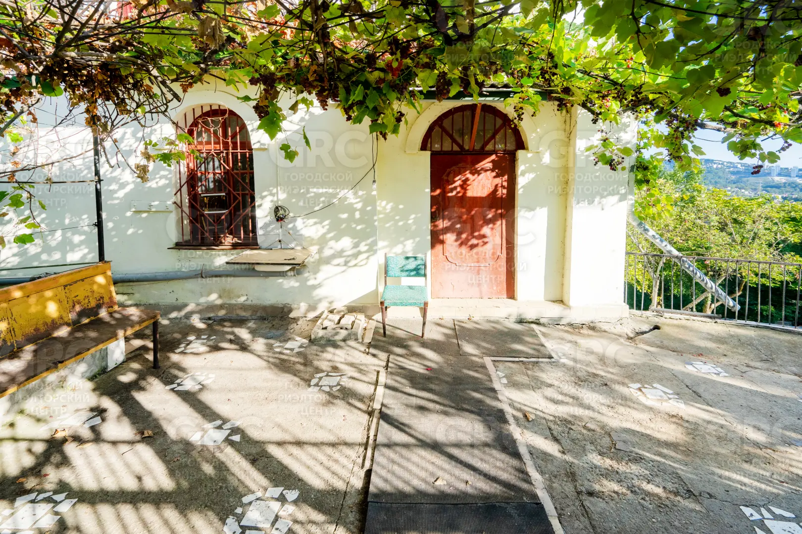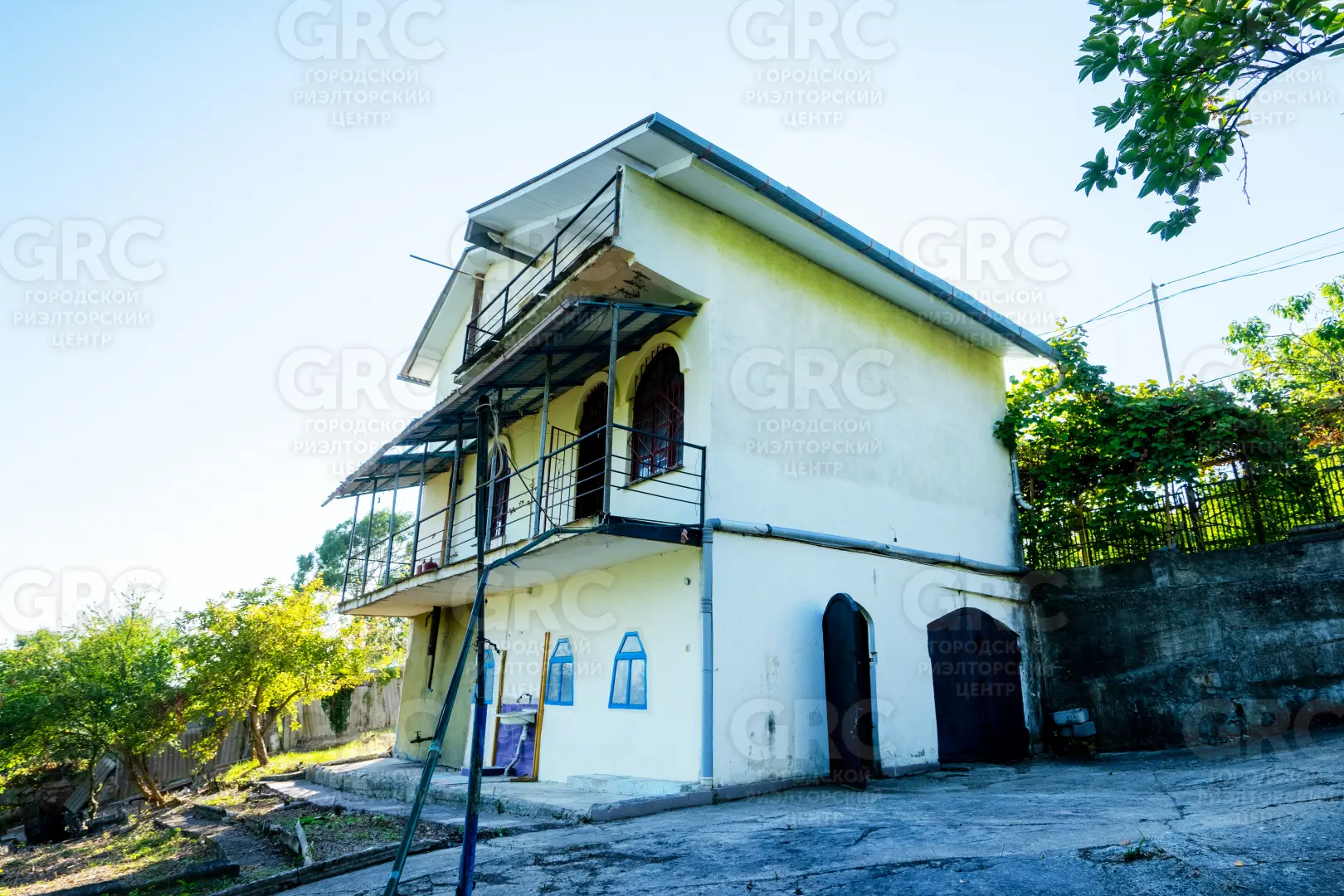 Около входа есть тенистая терраса из лозы винограда, въезд на участок осуществляется к нижнему уровню дома, но возможно создание горизонтальной парковки на сваях, с одной стороны участок граничит с местной дорогой, транзитное движение по которой не осуществляется, с двух сторон граничит с национальным парком.