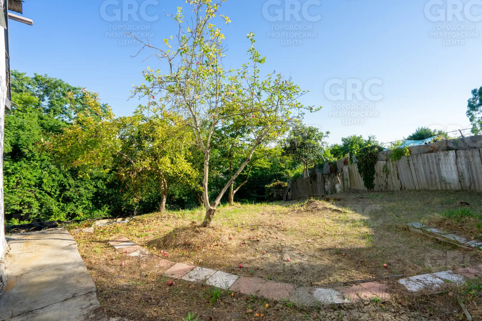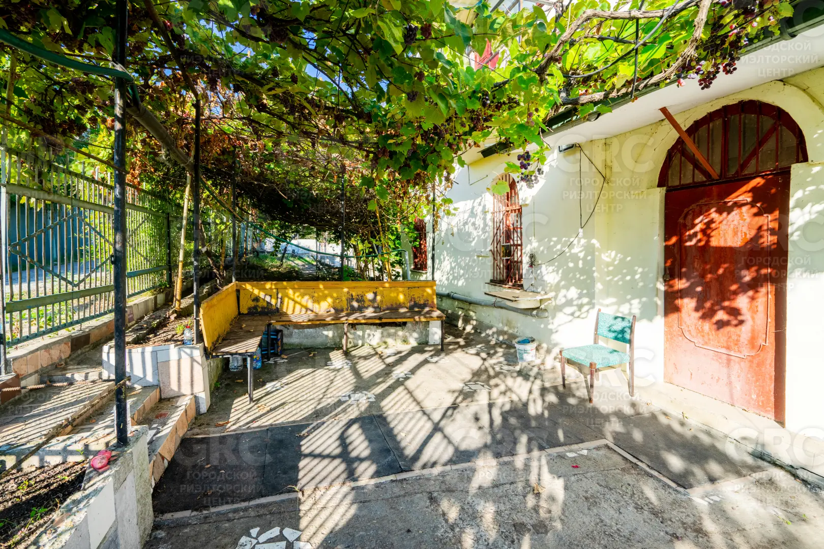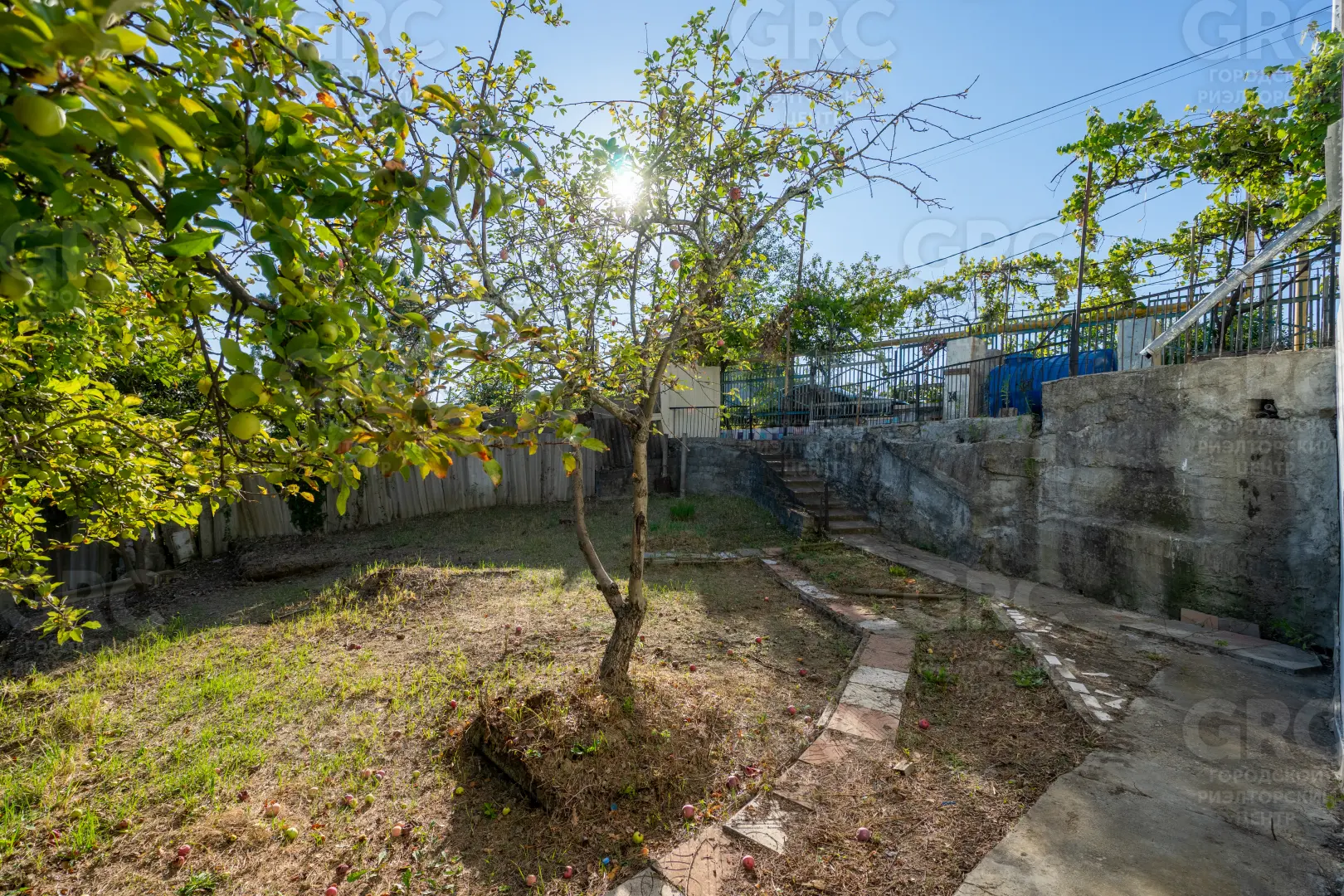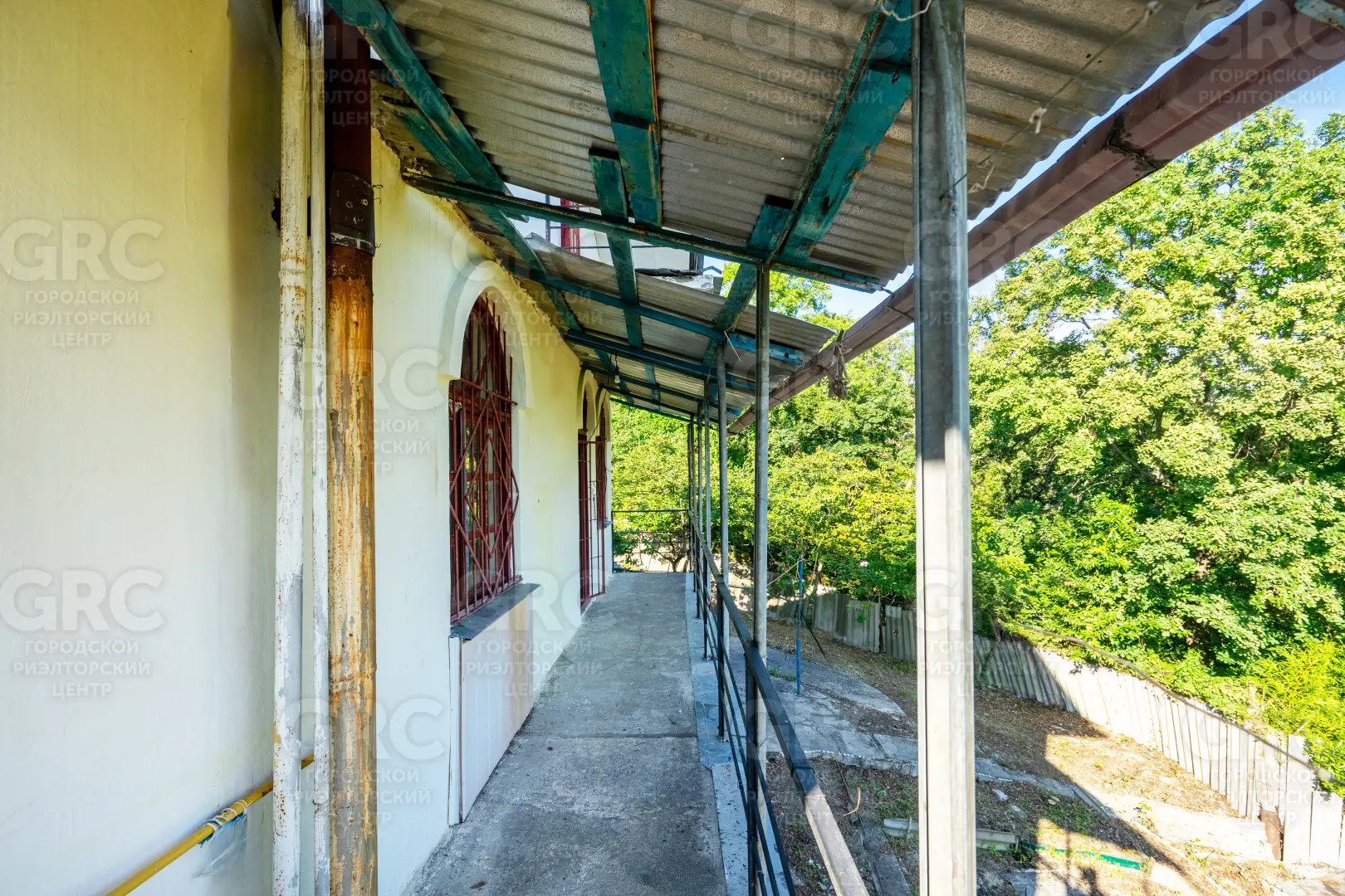 Около входа есть тенистая терраса из лозы винограда, въезд на участок осуществляется к нижнему уровню дома, но возможно создание горизонтальной парковки на сваях, с одной стороны участок граничит с местной дорогой, транзитное движение по которой не осуществляется, с двух сторон граничит с национальным парком.