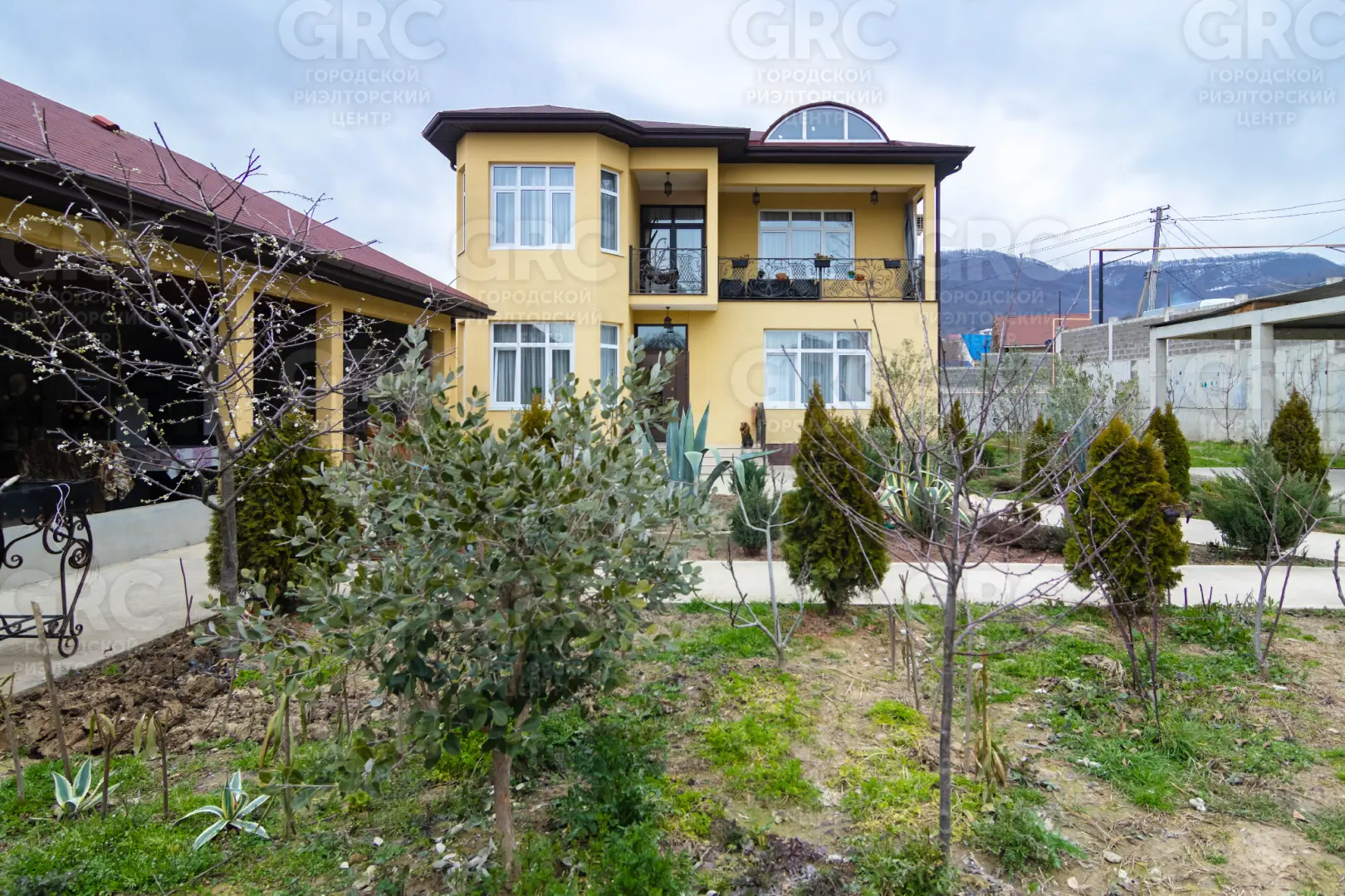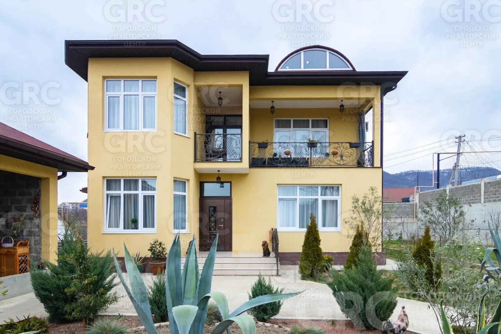 На земельном участке, который составляет 16 соток, выполнено ландшафтное озеленение; установлены скульптурные композиции; есть площадка для нескольких машин, а также построен и гостевой дом с летней верандой.