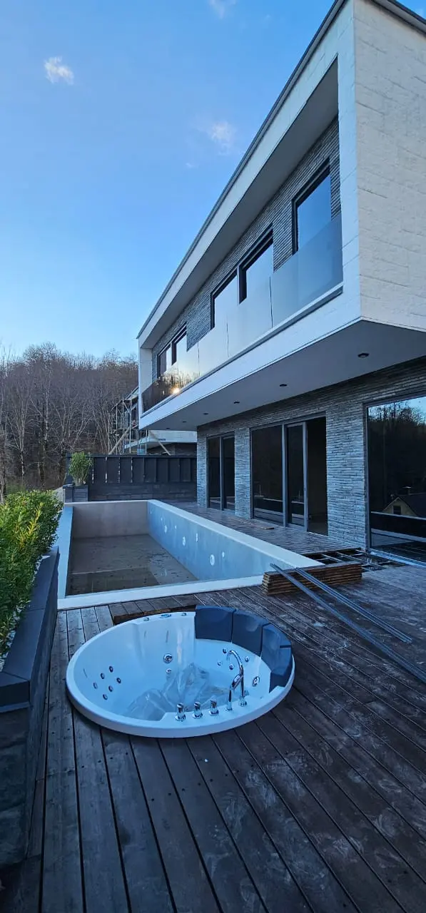При входе в дом вас встретит просторный гараж на 4-5 машин с потолками высотой более 4 метров. Для вашего комфорта в доме также есть отдельная комната для персонала. Панорамные окна премиального класса, выполненные из алюминиевых профилей, пропускают много естественного света и позволяют насладиться красивыми видами гор.