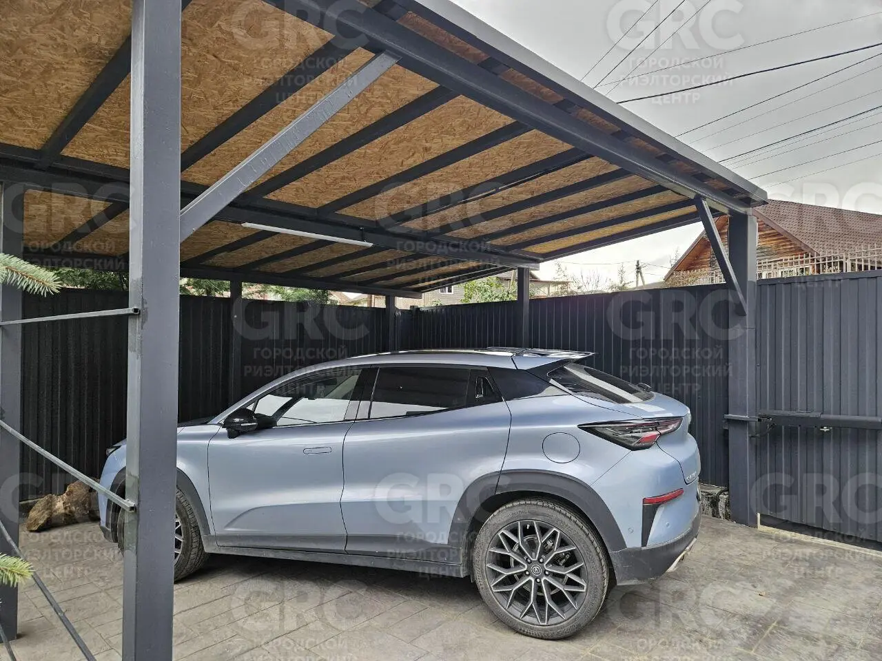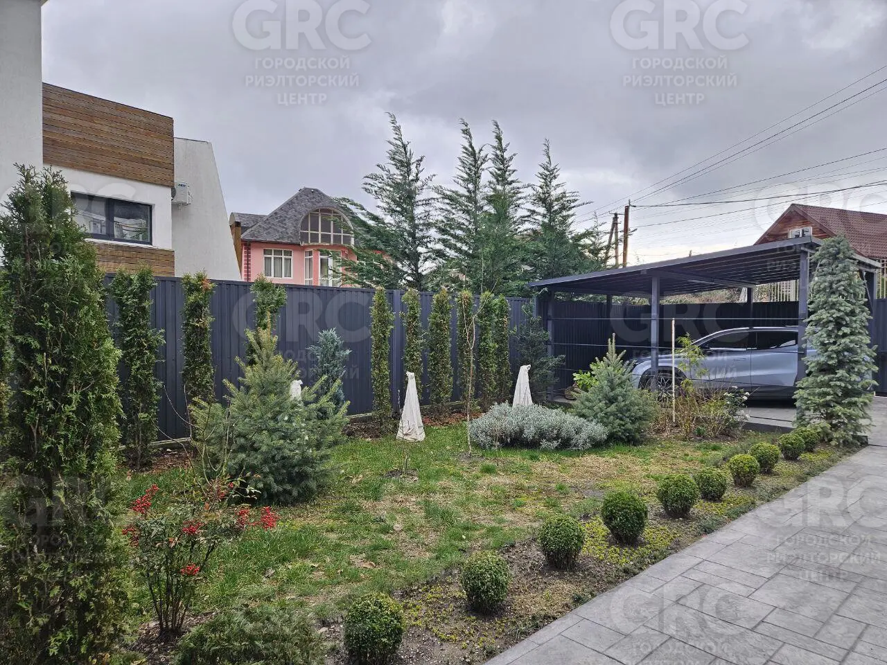 На участке ландшафтное озеленение, есть навес для автомобиля, уютная терраса, мангальная зона, хозяйственный блок, а также есть место для установки бассейна. Проектом предусмотрена дополнительная точка подключения газа, которую можно использовать для барбекю, подогрева бассейна или бани.