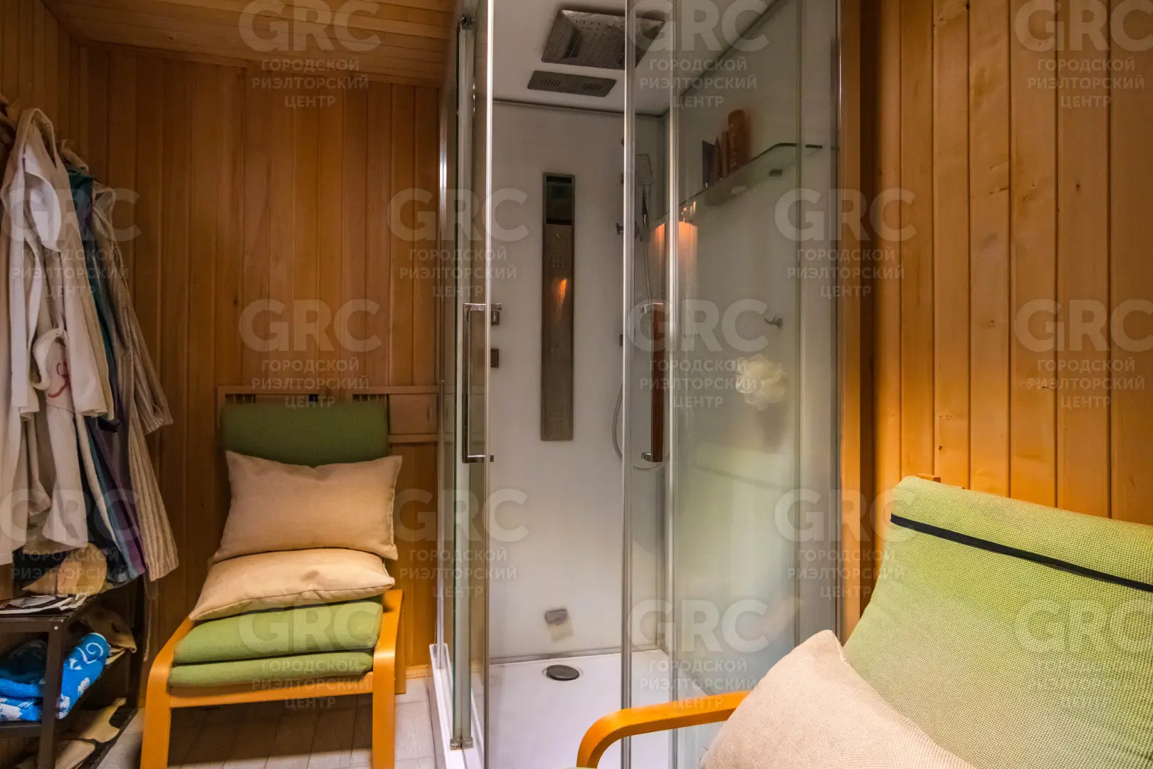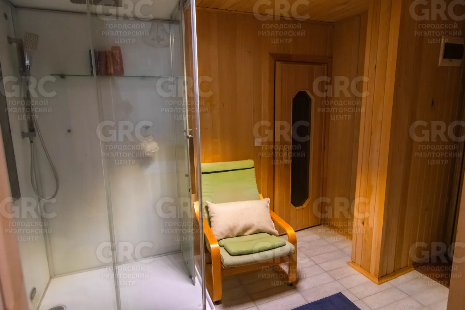 На первом этаже дома расположены: кухня-столовая с панорамными окнами и выходом на террасу, а также холл, сауна, санузел и спальня.