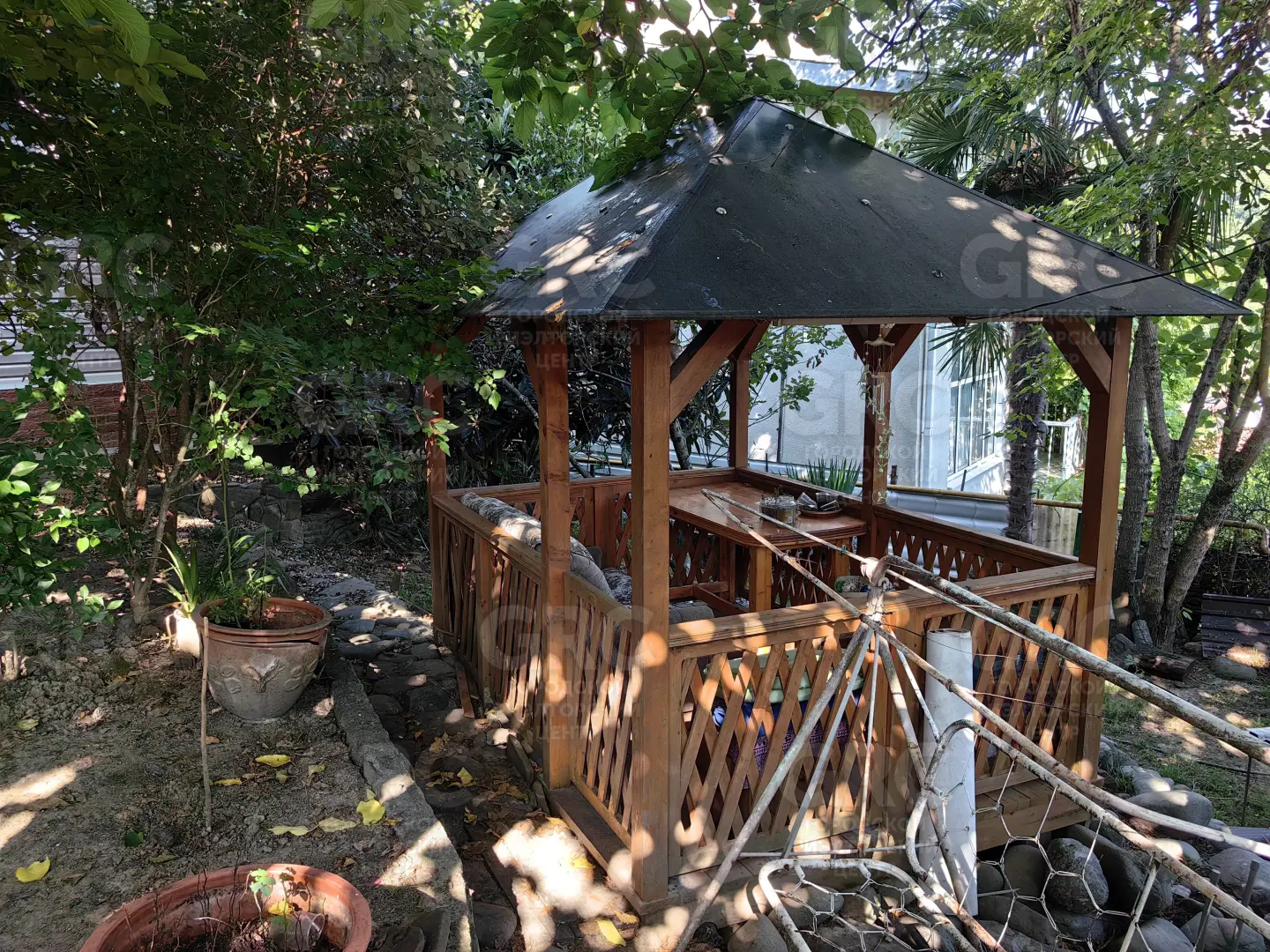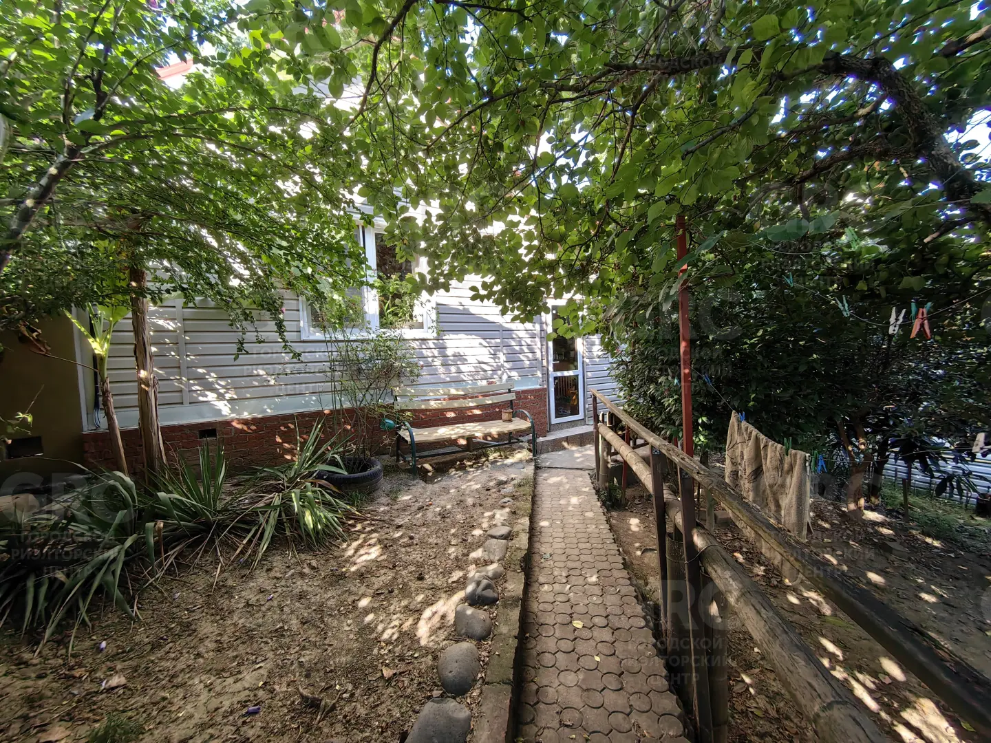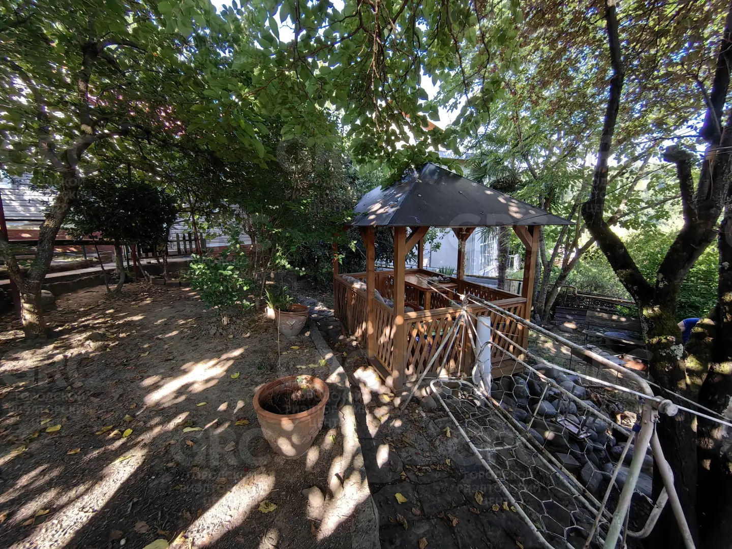 Участок ухожен - оборудован огородик и растет плодоносящий сад: орех фундук, виноград, инжир, фейхоа, шелковица черная и белая, мушмула, алыча, яблони, киви, хурма и экзоты (юкка, бананы и пальмы).