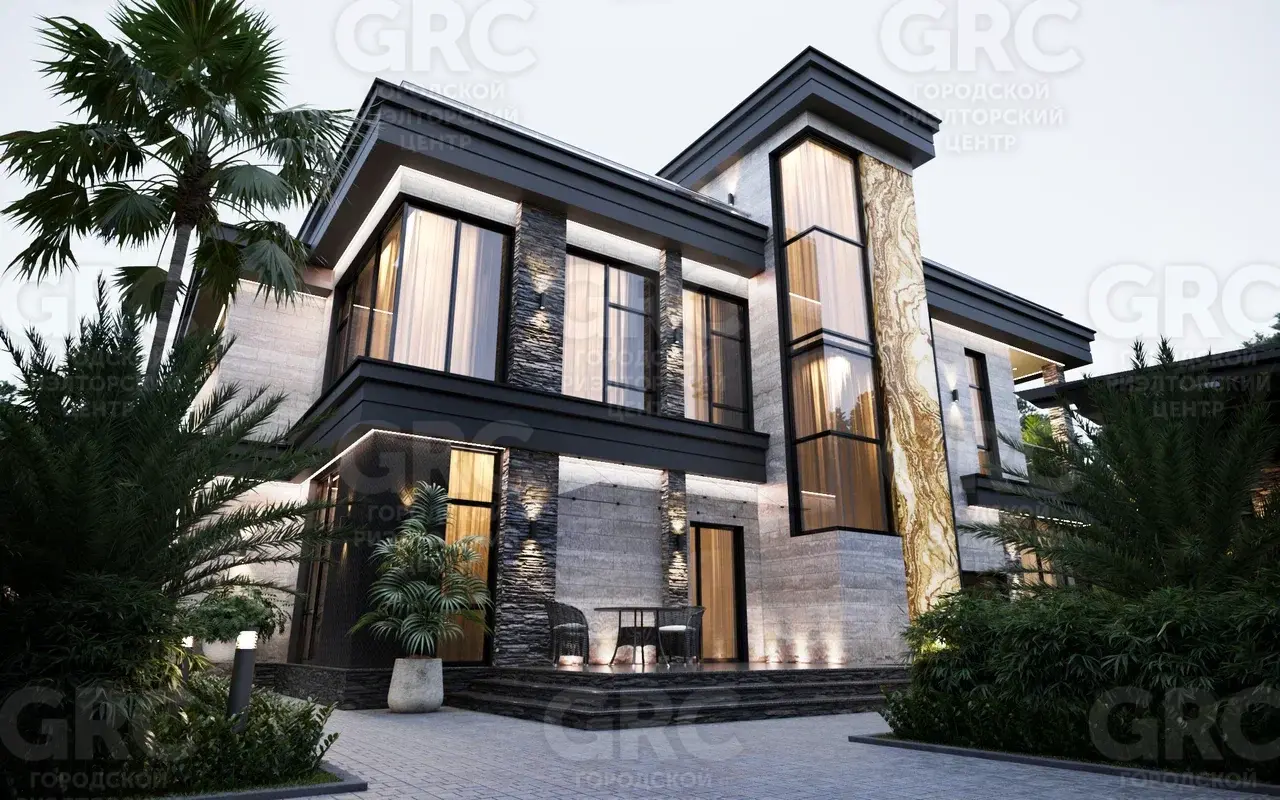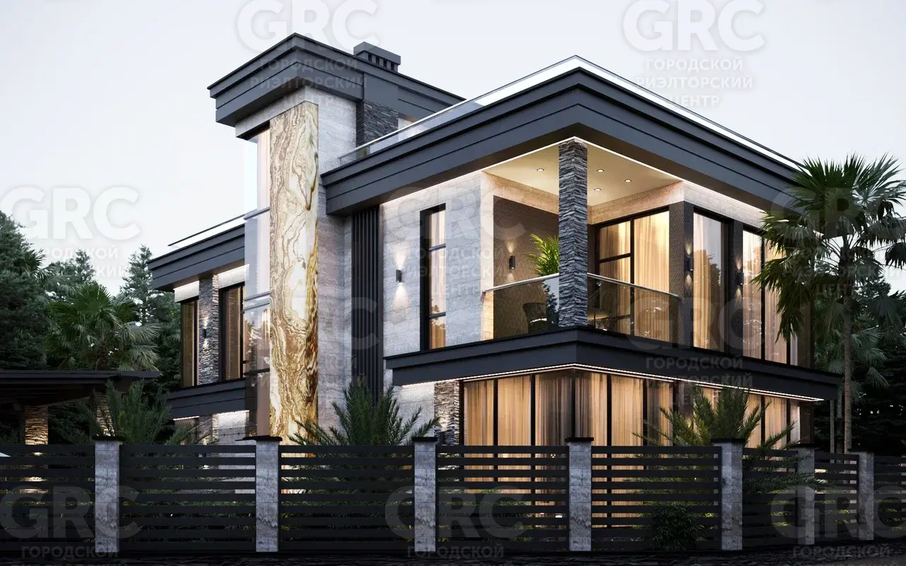 Фасады домов украшены срезами из оникса. Это решение дарит легкость и неповторимость внешнему виду коттеджей.