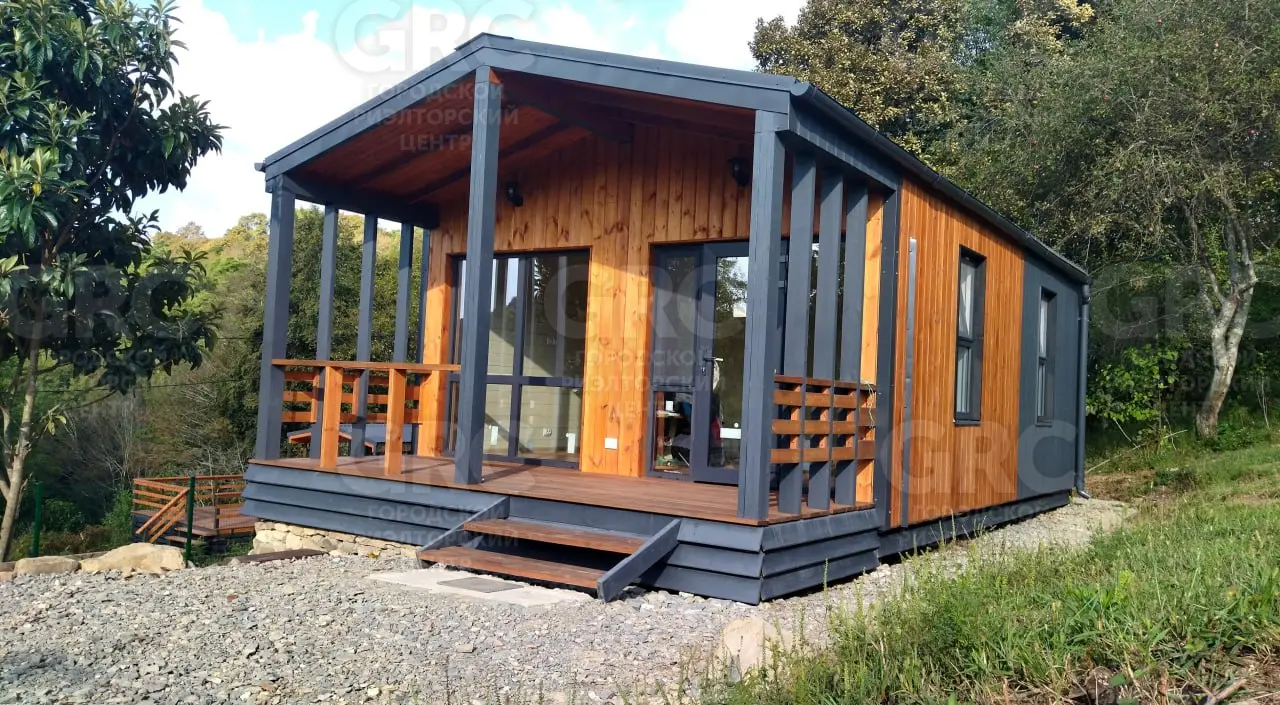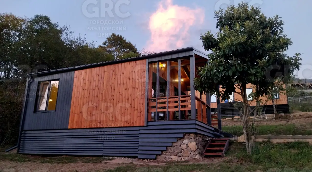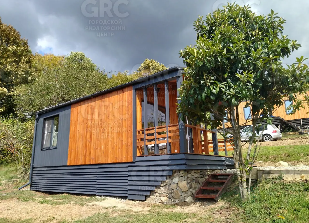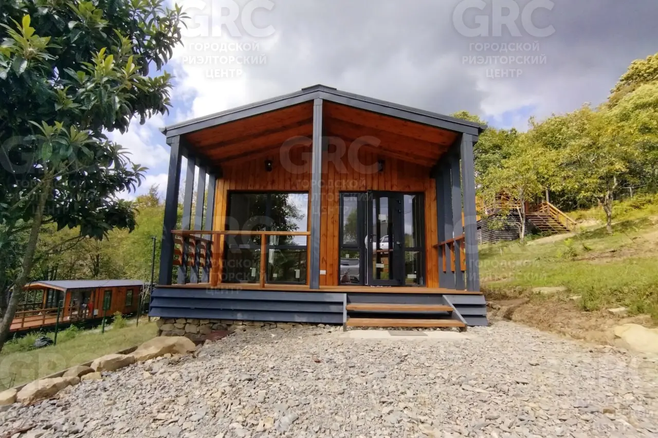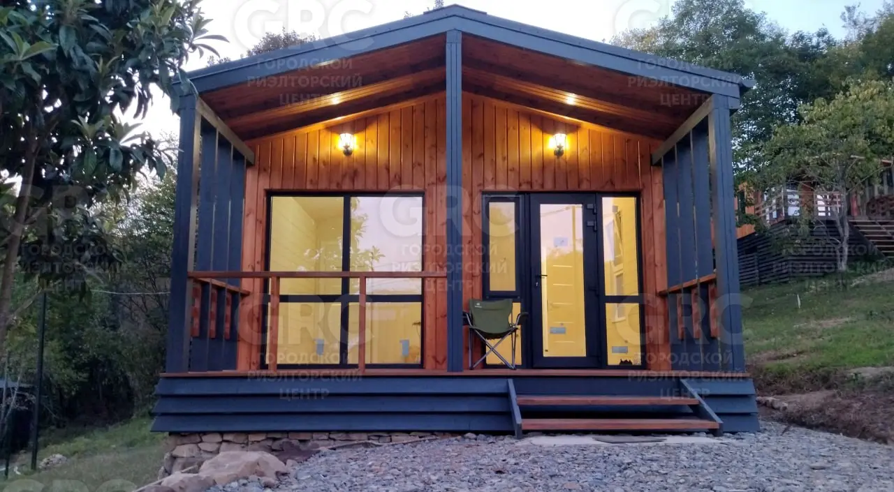 Площадь участка - 425 м2, площадь дома - 42 м2, 2 комнаты. Цена: 7,9 млн. руб. Новый дом в небольшом строящемся коттеджном посёлке в стиле «Барнхаус». Территория закрыта, посторонних нет. Верхнее Лоо, 5 км. от моря. Хорошая транспортная доступность. Активно развивающийся район, есть школа, магазины, ресторан, круглогодичный аквапарк и в то же время рядом лес, красивое горное ущелье, прекрасный панорамный вид. Статус ИЖС, кадастр, возможна ипотека. Проектировщик и исполнитель строительных работ - компания «Серьёзное Дело». Дом построен по каркасно-рамочной или т.н. «канадской» технологии - каркас из древесины камерной сушки обработанный огнебиозащитой , утеплённый плитной минеральной ватой на винтовых сваях с двухскатной крышей. Две комнаты, санузел, терраса. Высота потолков 2,4 - 3,0 м. Автономное водоснабжение - артезианская скважина, электросеть 15 кВт. Тариф на электричество сельский. Канализация - индивидуальный автономный ЛОС. Отделка фасада имитацией бруса окрашенная красками Tikkurila. Кровля - профнастил с полимерным шумопоглощающими покрытием. В доме выполнена чистовая отделка из качественных материалов: вагонка «штиль» заводской окраски безопасными красителями на водной основе, водостойкий ламинат QuickStep, межкомнатные двери ProfilDoors. В санузле «тёплый пол» и установлена сантехника. Панорамные окна в пол и терраса под крышей с великолепным видом. Дом готов к проживанию.