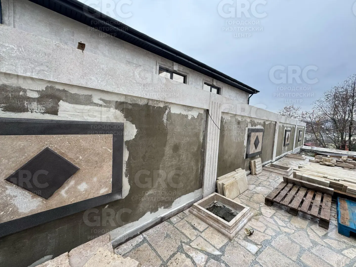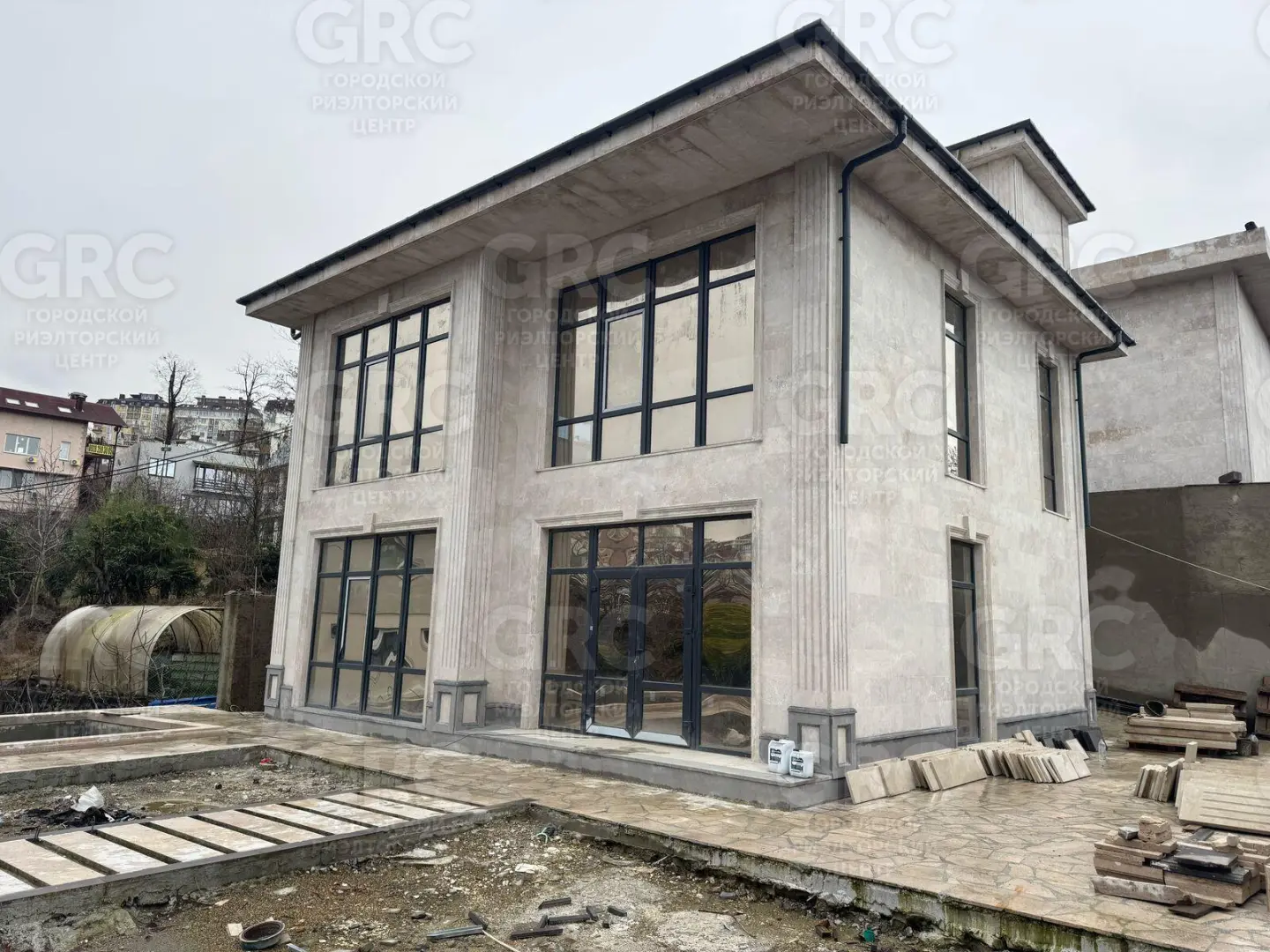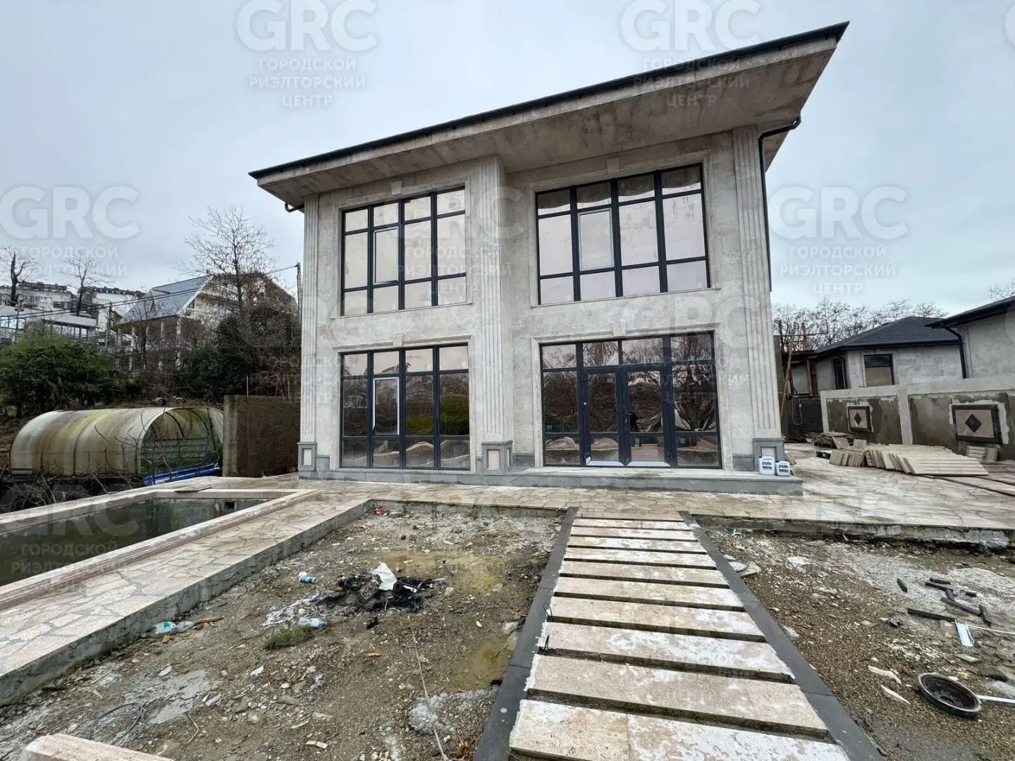 Дом расположен на 4 сотках ровного земельного участка, где так же размещены бассейн, ландшафтное озеленение и паркинг на 2 автомобиля.