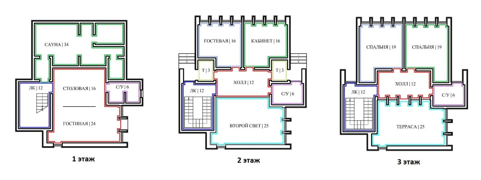 Площадь этого коттеджа составляет 252 квадратных метра. На каждом из трех этажей вы найдете удобные планировки, включающие в себя кухню-гостиную с потолками высотой 6,2 метра, что создает ощущение простора и свободы. В доме также есть три спальни, рабочий кабинет и просторная зона под сауну со Spa-пространством.