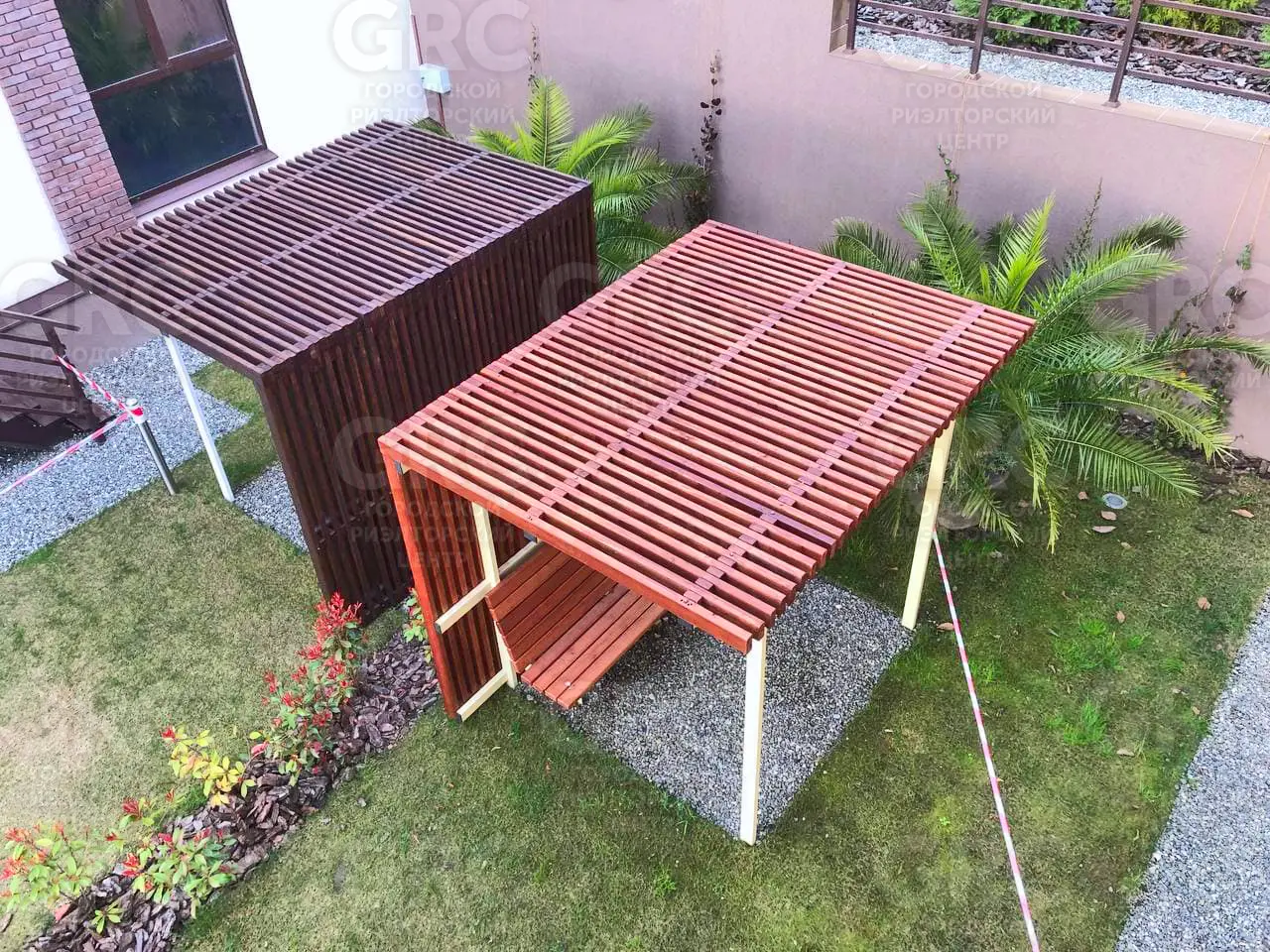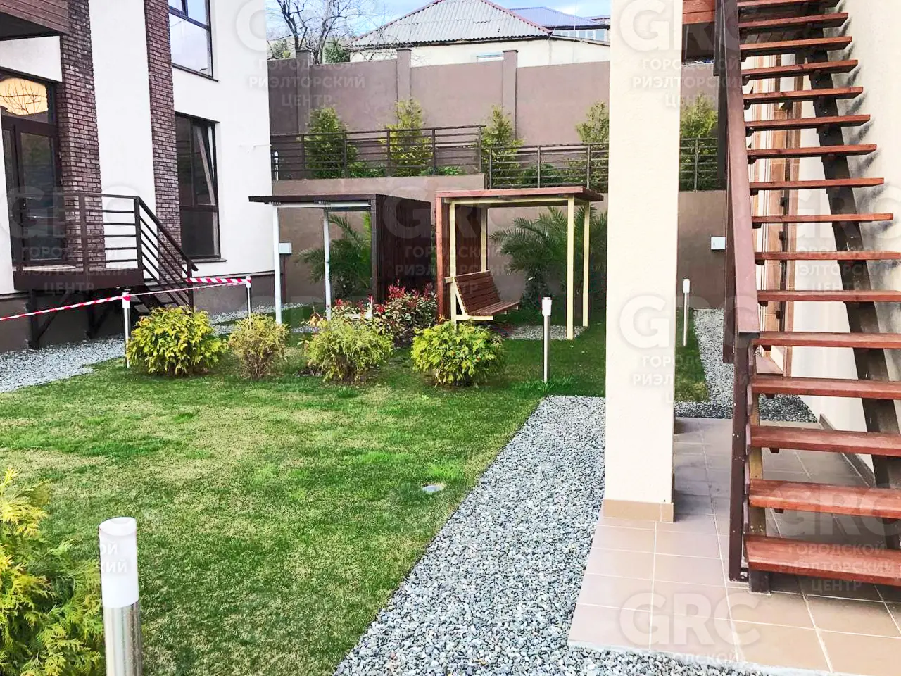 Сад оборудован системой автоматического полива и ландшафтным озеленением.