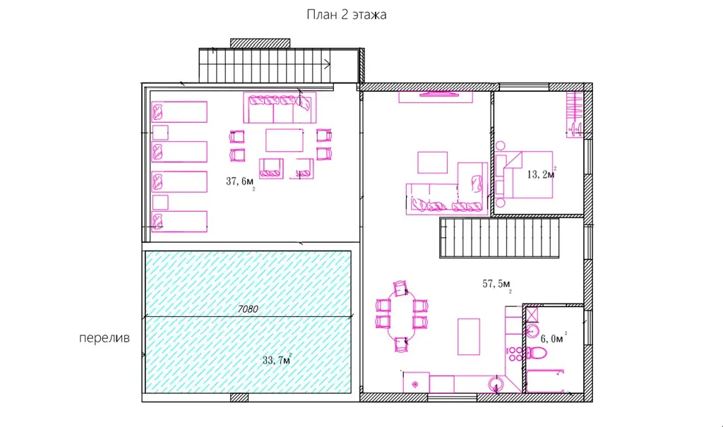 2 этаж: бассейн, четыре спальни, два санузла, кухня-гостиная.