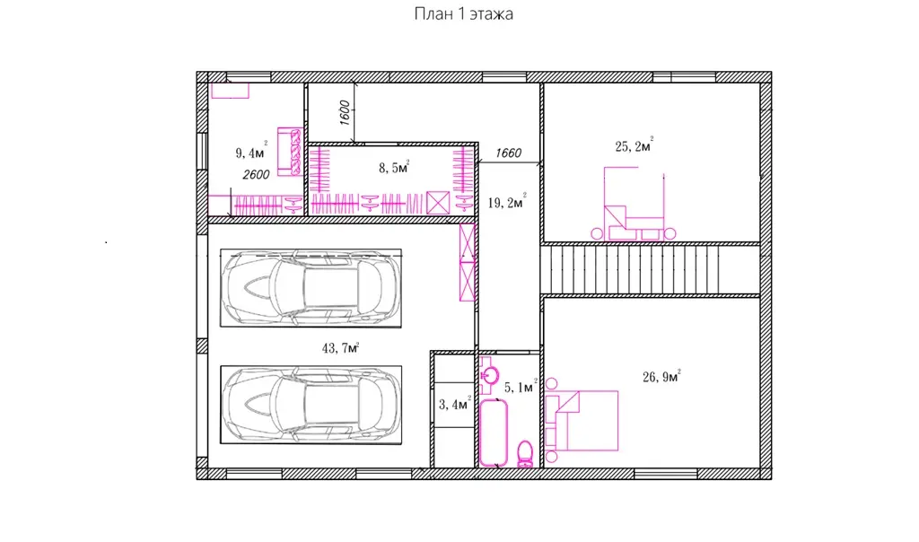 1 этаж: гараж на две машины, две спальня, гардеробная, кладовая, санузла.