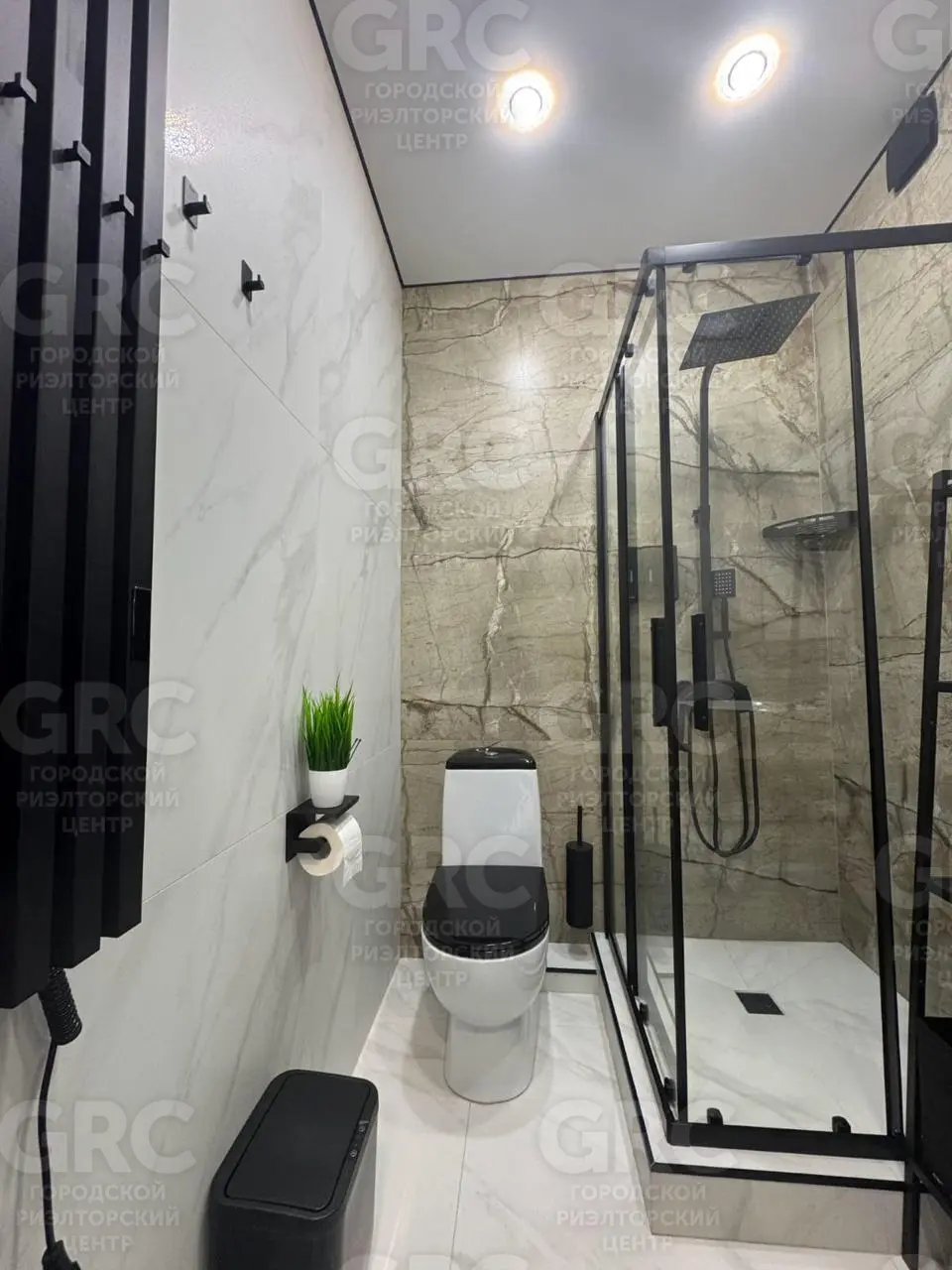 Просторная и светлая кухня-гостиная с большим комфортным диваном и санузел с душевой кабиной.