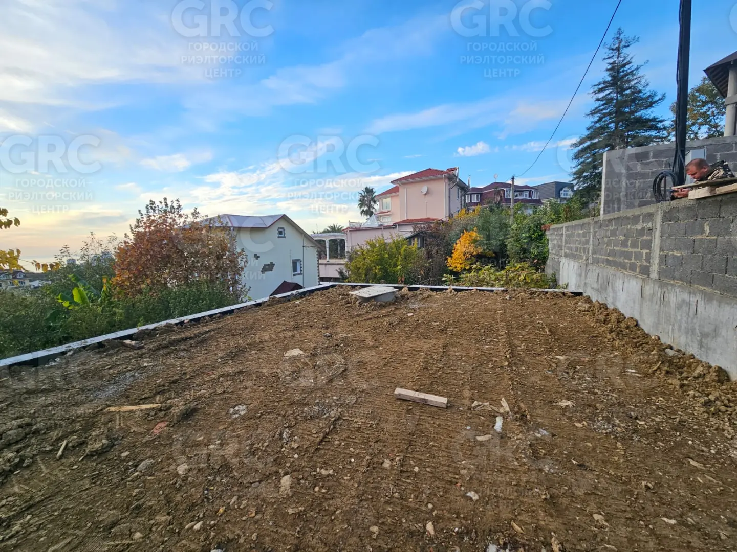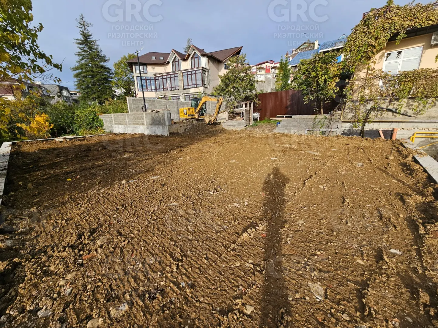 Участок подготовлен к строительным работам, выполнена подпорная стена, участок выровнен.