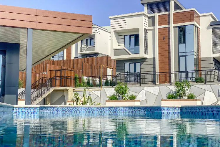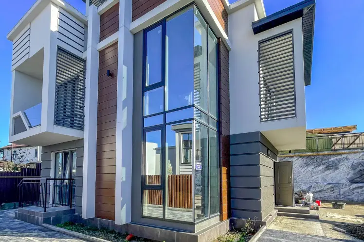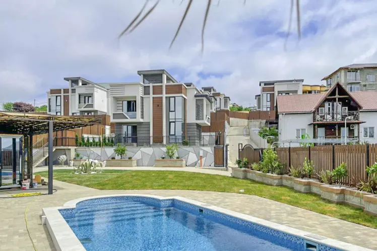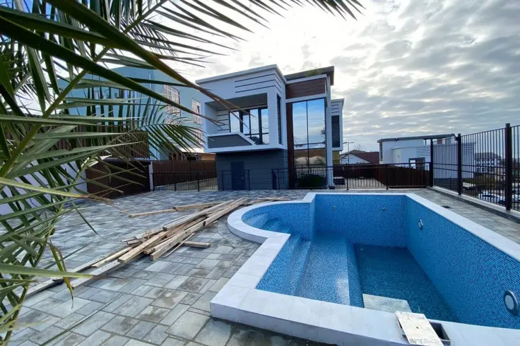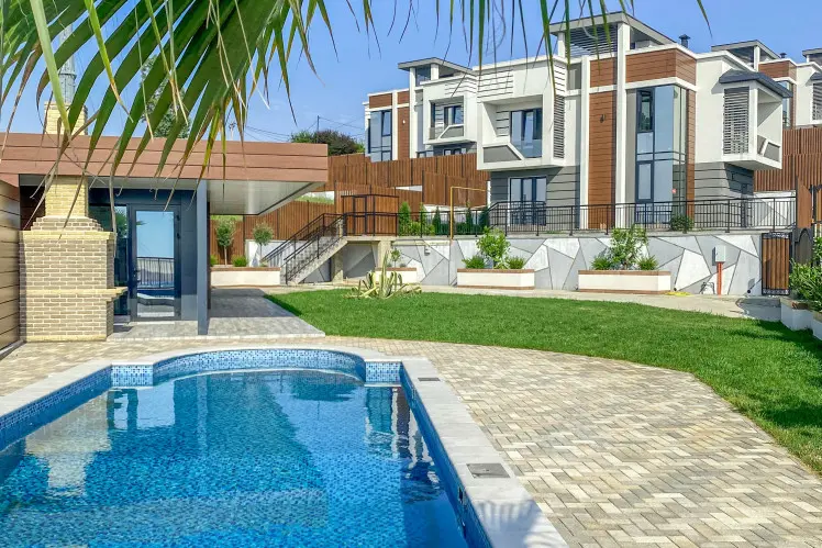 Дома построены в монолитно-каркасной технологии с блочным заполнением. Фасад выполнен из декоративной штукатурки, а также других элементов декора. На территории домов предусмотрен ландшафтный дизайн, зона отдыха и барбекю, бассейн, парковочная зона, эксплуатируемая кровля. Есть выходы на балкон и террасу. Коммуникации в доме центральные.