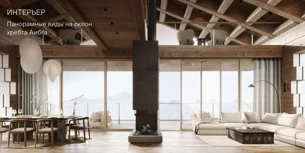 В интерьерах оживает история горных владений, где классический стиль европейского шале XVI века обретает современное звучание. Пространство поражает своим масштабом и тщательно продуманной гармонией деталей, создавая идеальные условия для отдыха после насыщенного дня, проведённого среди величественных гор. Большие панорамные окна наполняют помещение светом и открывают захватывающие виды, соединяя внутренний уют с природной мощью. Здесь всё напоминает о той особенной радости, когда, возвращаясь с зимней охоты, входишь в тёплый дом, где в камине уже горит огонь, а каждый элемент интерьера словно шепчет о покое и безмятежности. Шале продаются в формате shell & core, благодаря чему каждый резидент может воплотить интерьерные решения, отражающие индивидуальные предпочтения, а профессиональная команда застройщика в этом поможет.