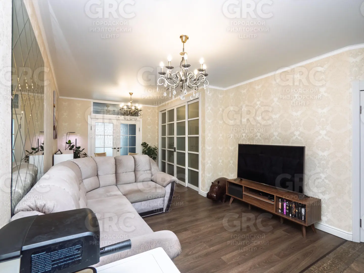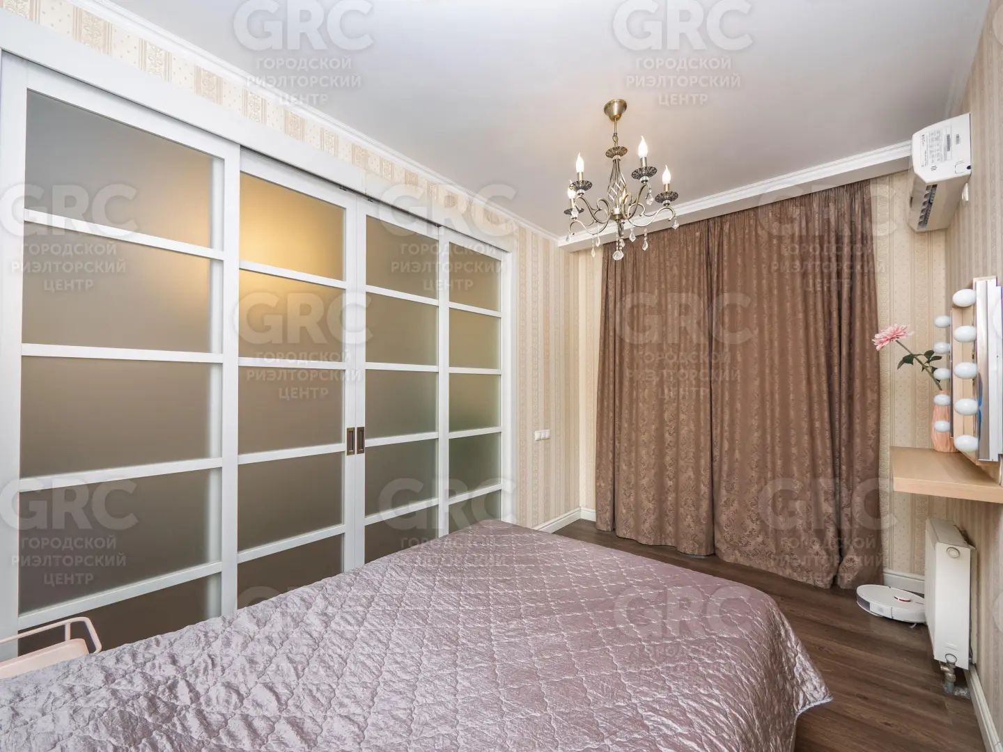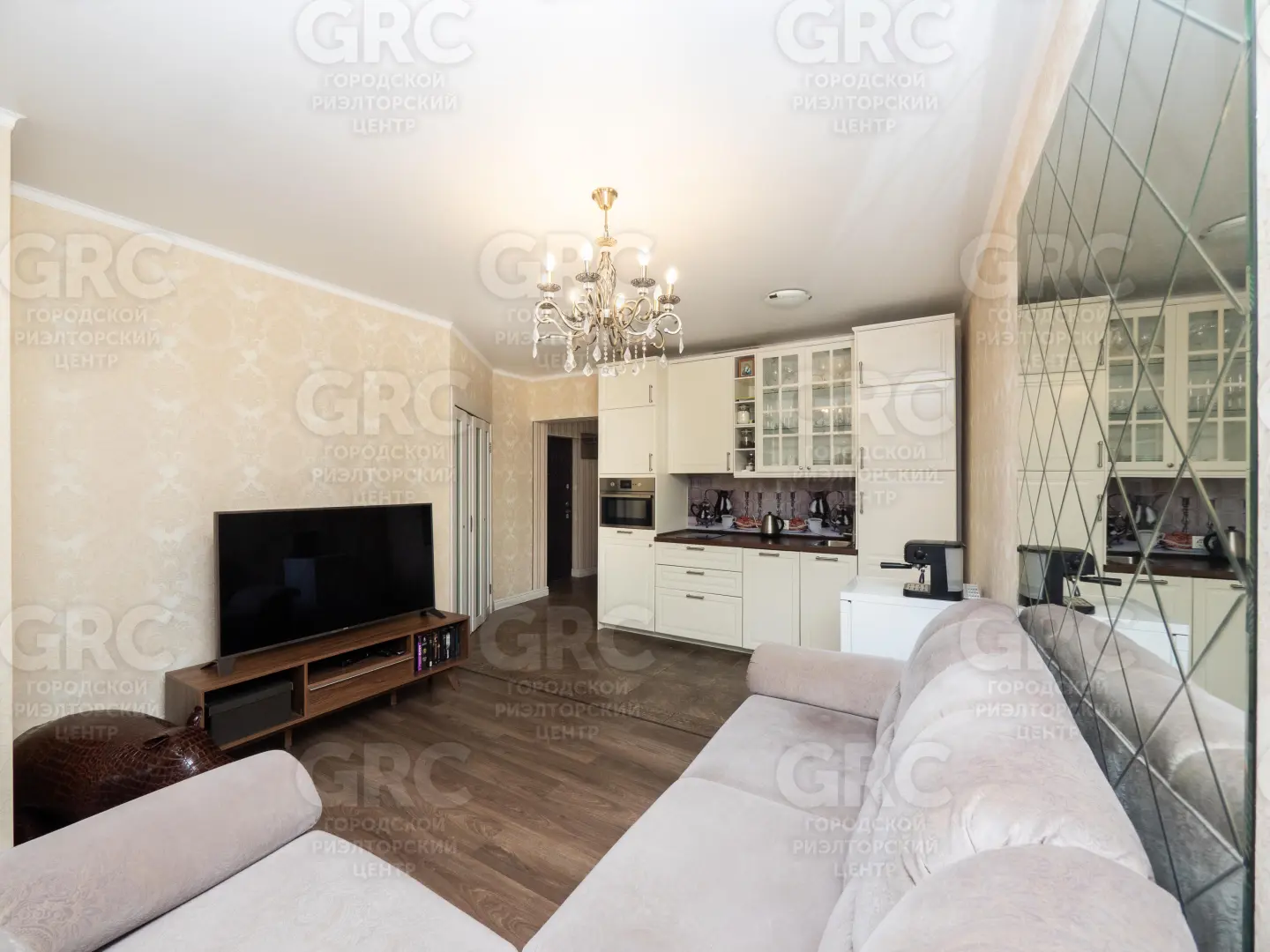 Квартира распланирована в кухню-гостиную и две спальни, гардеробную.
