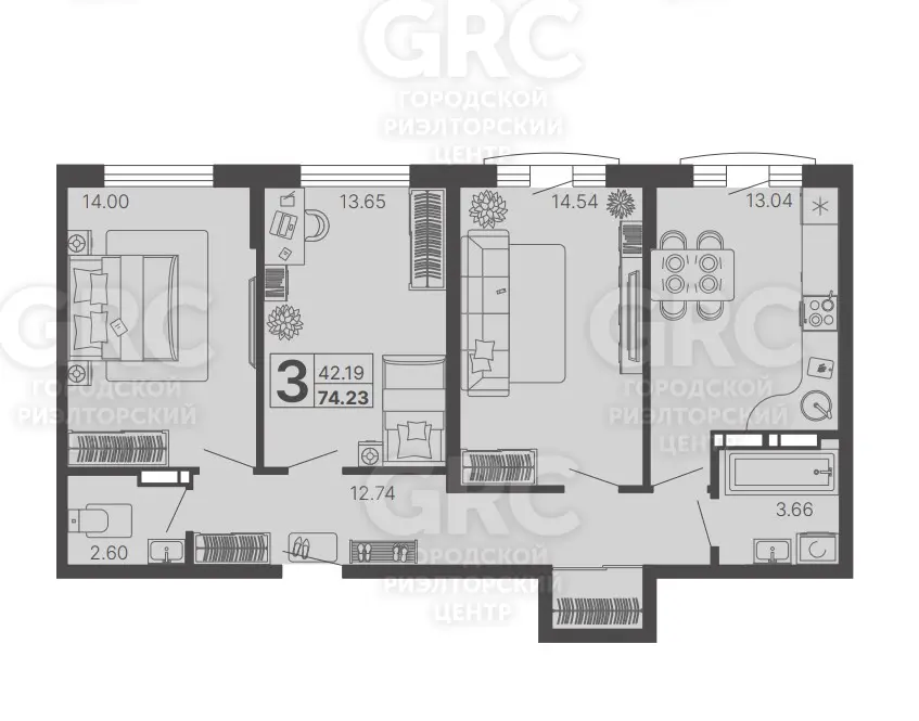 3-комнатная квартира, 74.21 м²