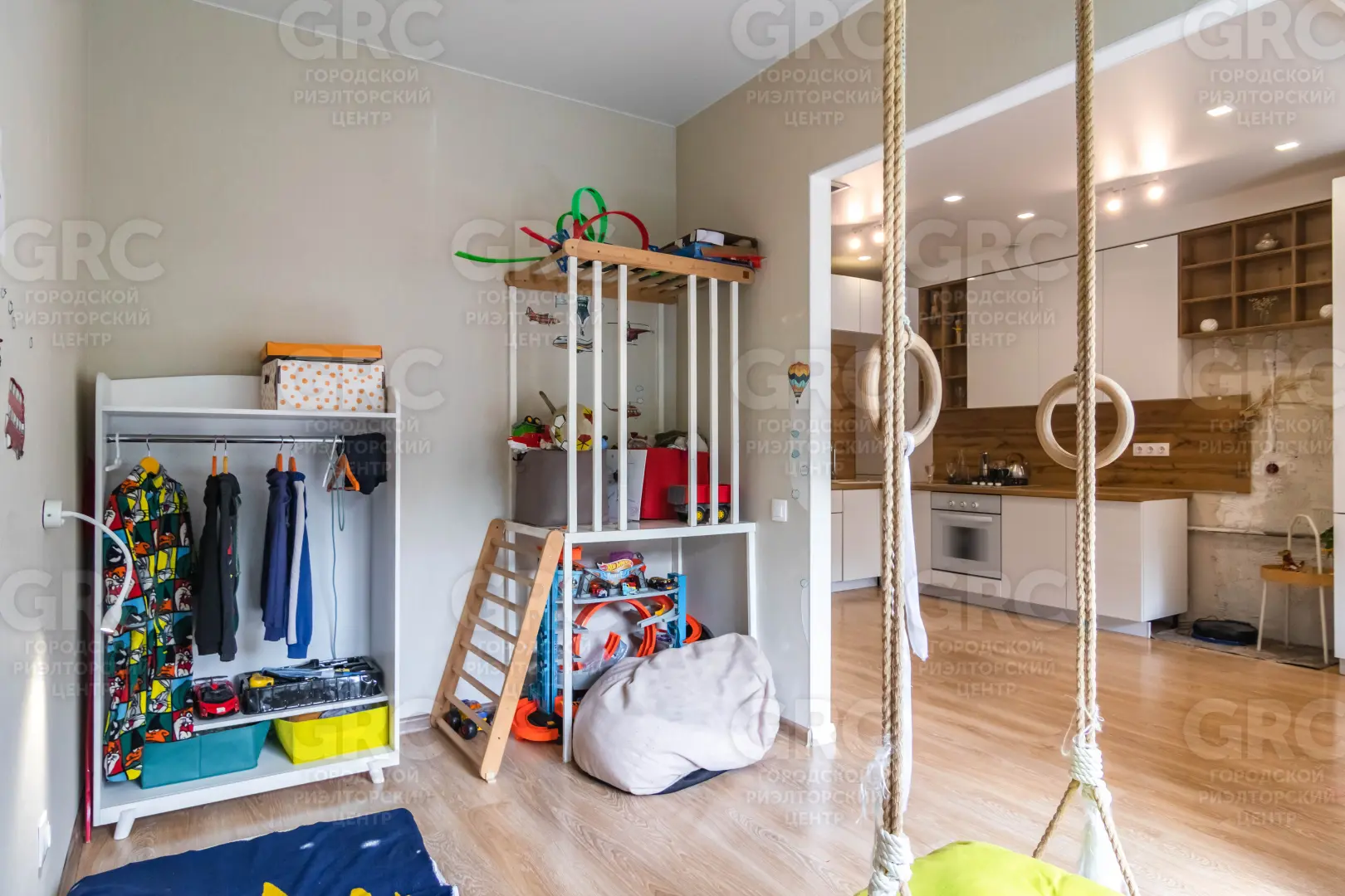 На первом этаже расположена просторная кухня-гостиная и детская комната. На втором этаже две спальни, гардеробная. Квартира имеет два санузла: на первом этаже туалет и душ, а на втором этаже туалет и ванная.