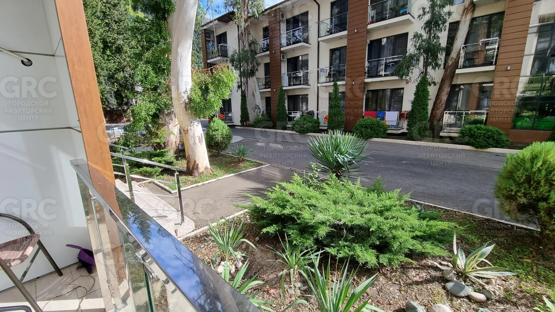 Территория всего комплекса (площадь 1Га) огорожена, украшена профессиональным современным ландшафтом и вековыми реликтовыми деревьями: кипарисы, раскидистые эвкалипты и магнолии. Въезд и вход на территорию осуществляется по электронным ключам и возможен только для жителей комплекса. Локация объекта так же уникальна!