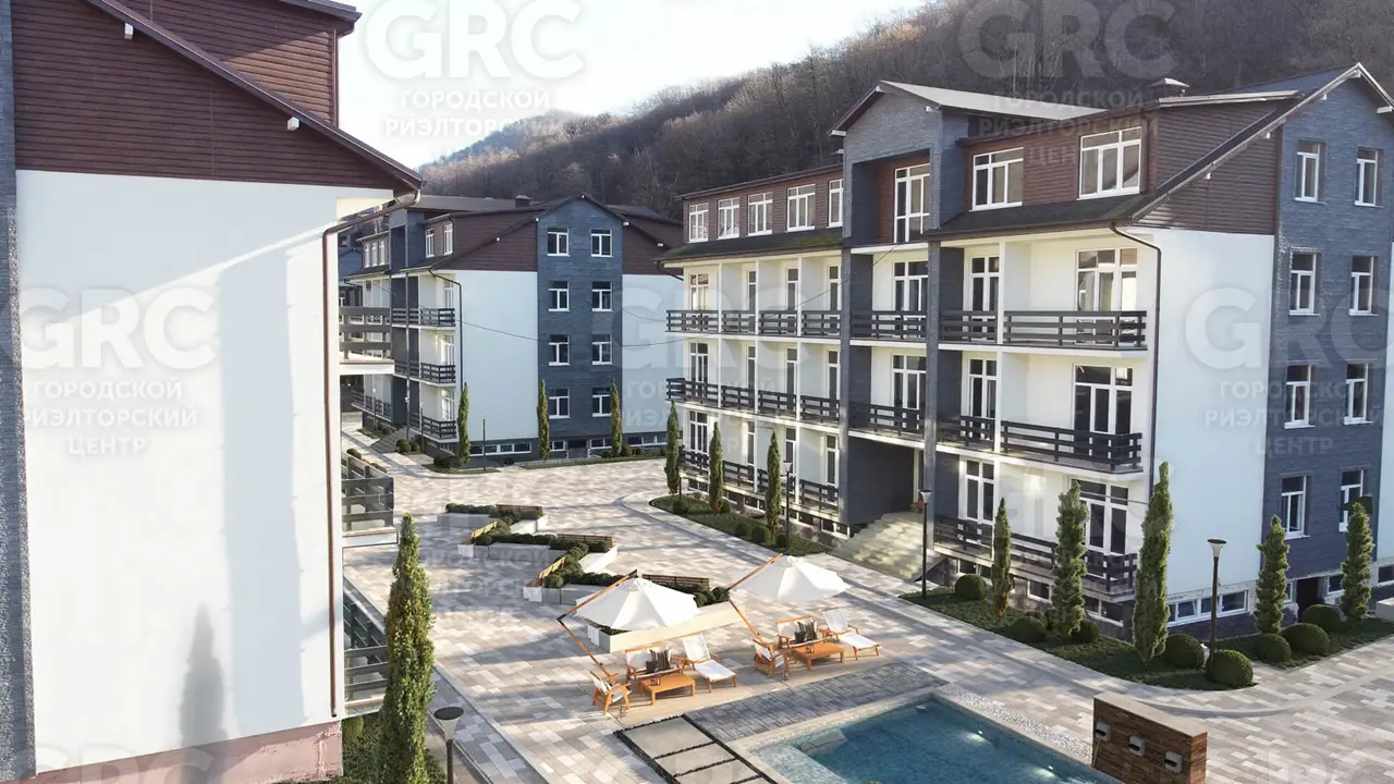 Комплекс бизнес-класса из 10 корпусов в едином стиле шале, с апартаментами от 20 м² до 45 м² . Из окон открываются виды на хребет Аибга и гору Ачишхо.