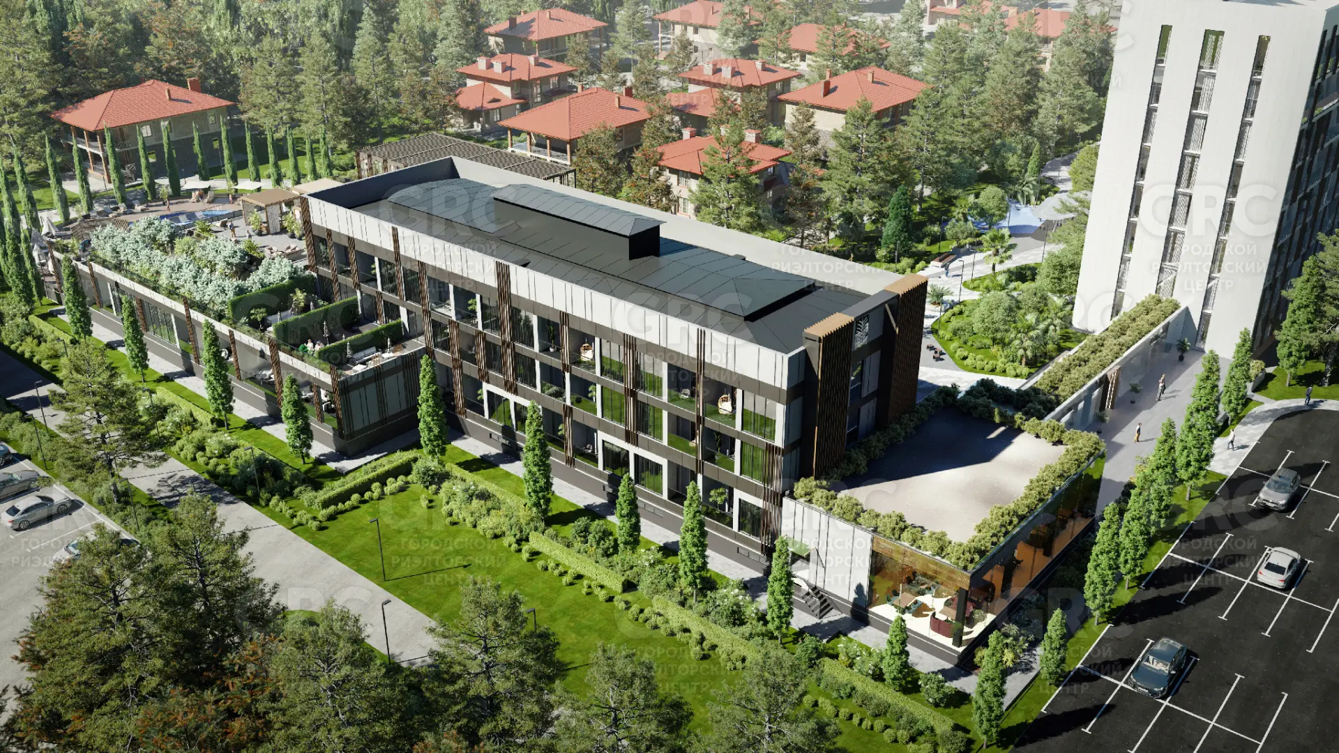 На первом этаже представлено лобби, ресепшн и ресторан с открытой террасой. Корпус оснащен двумя лифтами с премиальной отделкой.