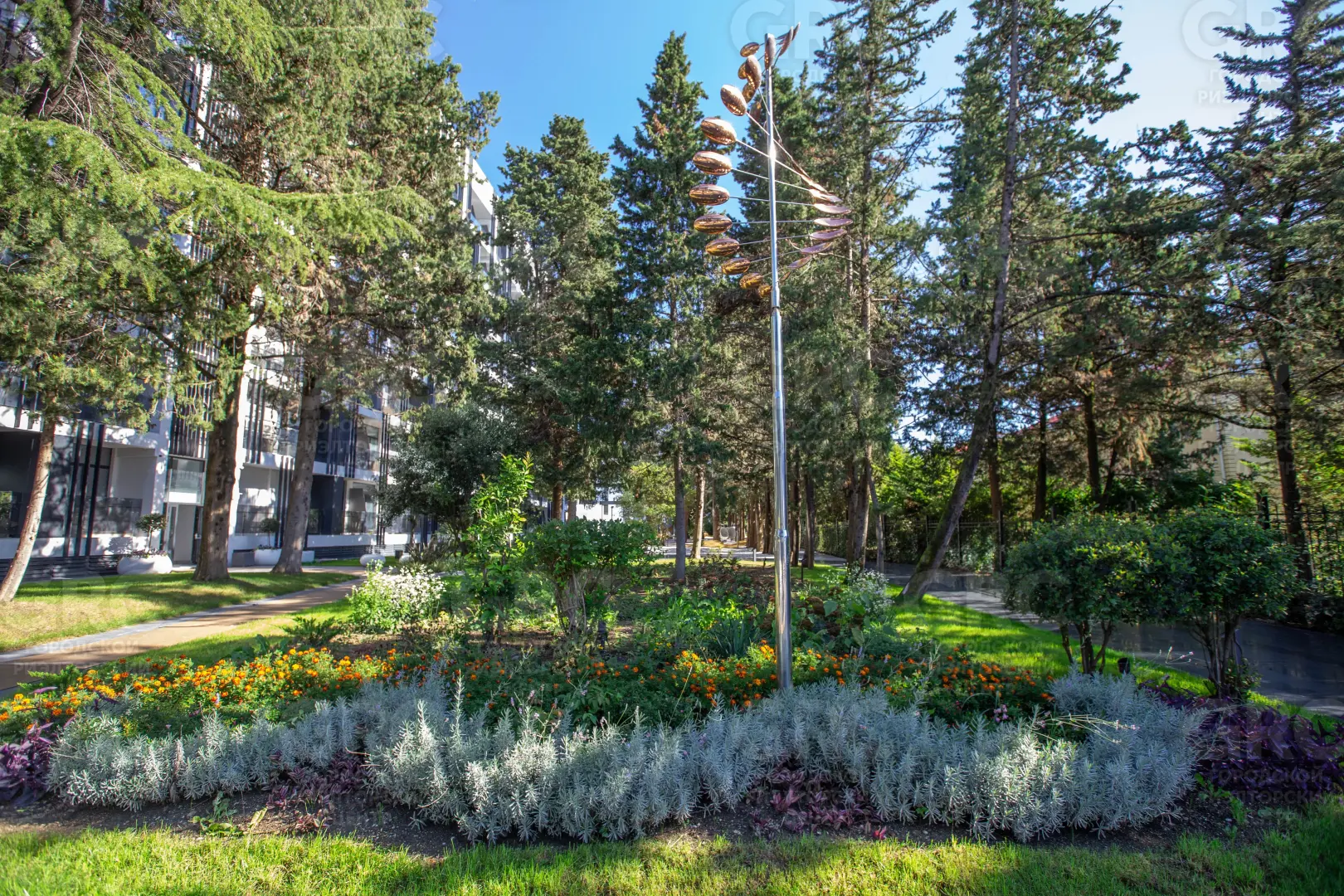 Территория апартаментного комплекса Моне составляет 1.6 гектар земли на первой береговой линии. Объект создается на базе бывшего санатория «СССР», помимо капитальных, советских построек, унаследовал собственный дендропарк с реликтовыми деревьями. Данные насаждения были посажены еще в 70-е годы, сейчас эти величественные деревья заграждают окна апартаментов от палящего солнца, а также наполняют ароматом хвои прогулочные дорожки, беседки, детский городок и читальную комнату.