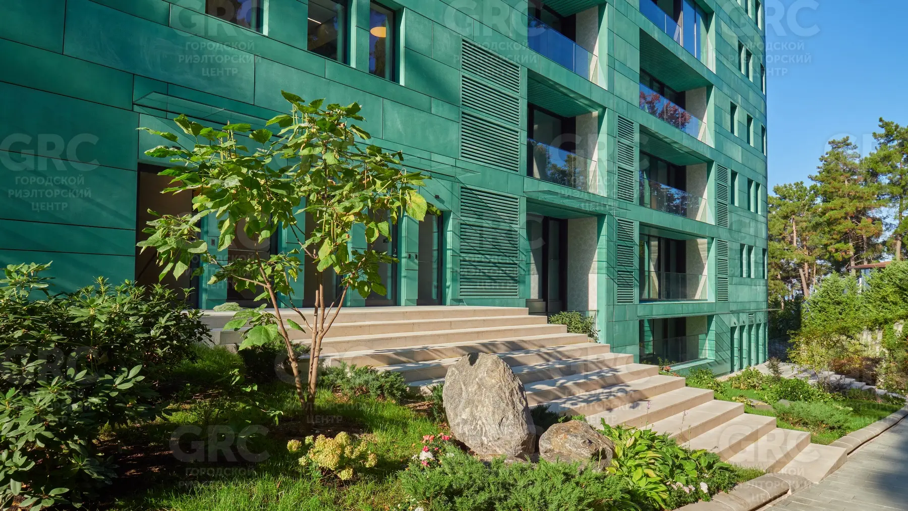 Нетривиальные решения по форме здания и силуэту фасада из патинированной меди изумрудного оттенка позволили естественно интегрировать Reef Residence в природную среду побережья. Великолепно обыгран существующий перепад рельефа, каскадом обустроены пологие террасы, что обеспечивает Reef Residence великолепными видовыми характеристиками с первого этажа.